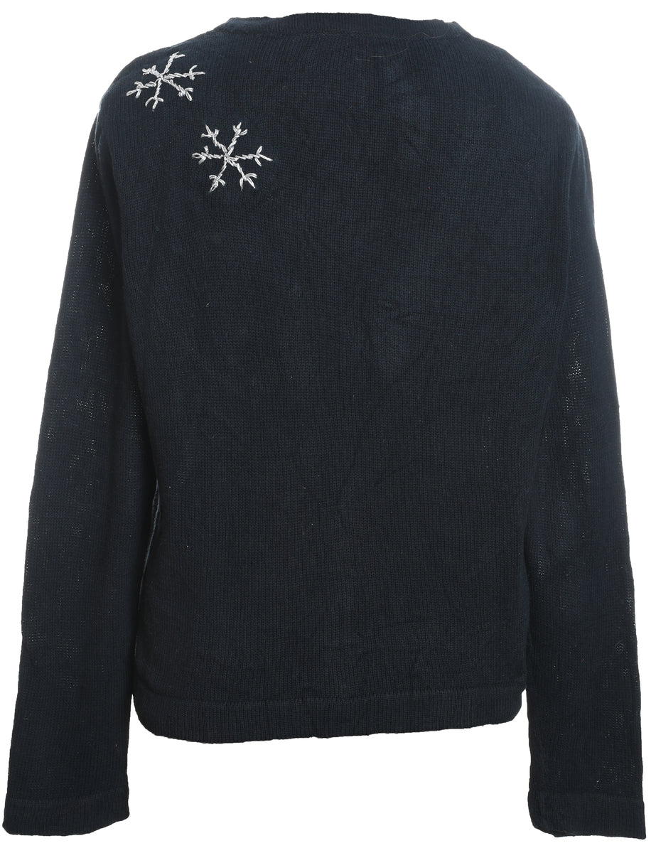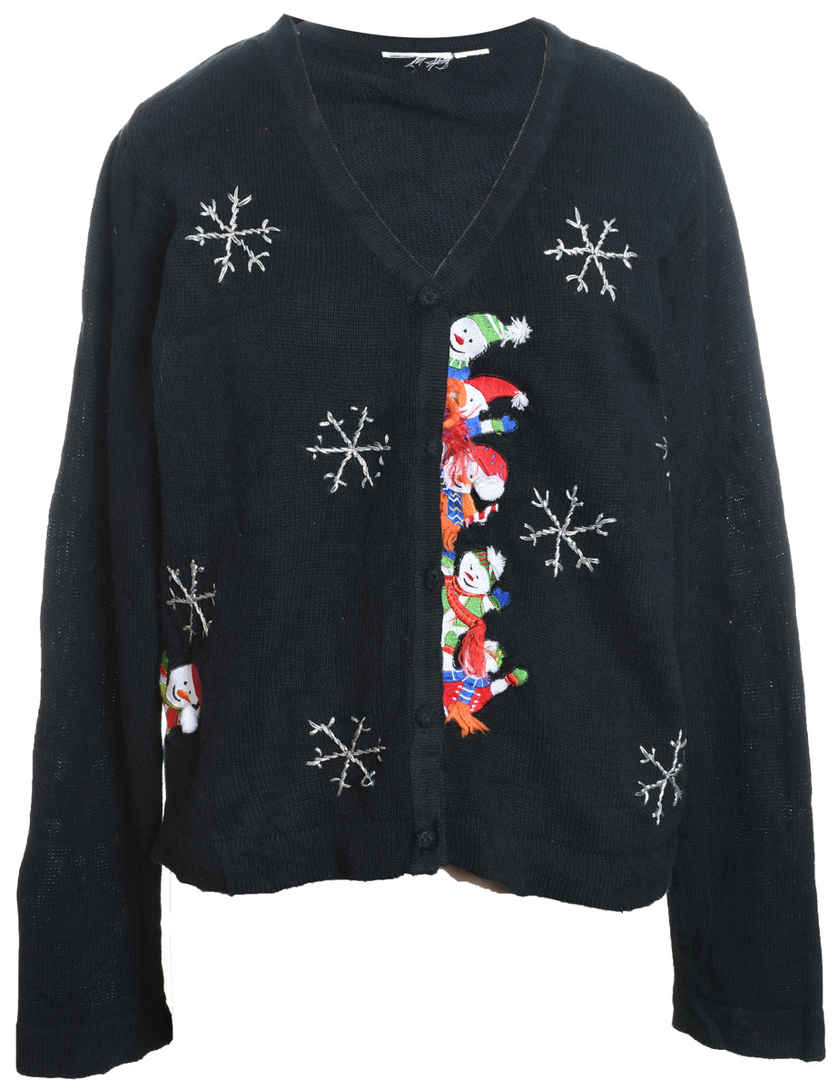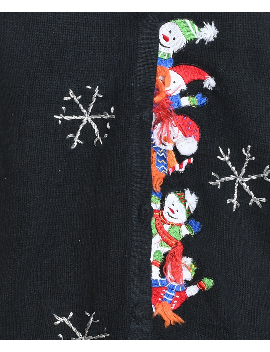 Snowman design black classic Christmas cardigan complete with a v-neck and lurex thread pattern.
