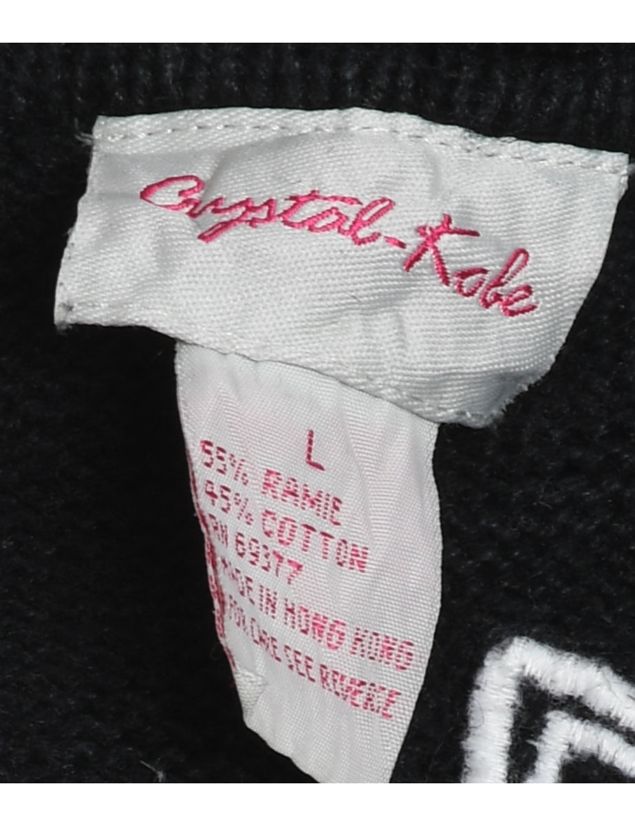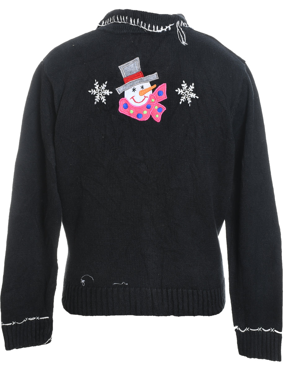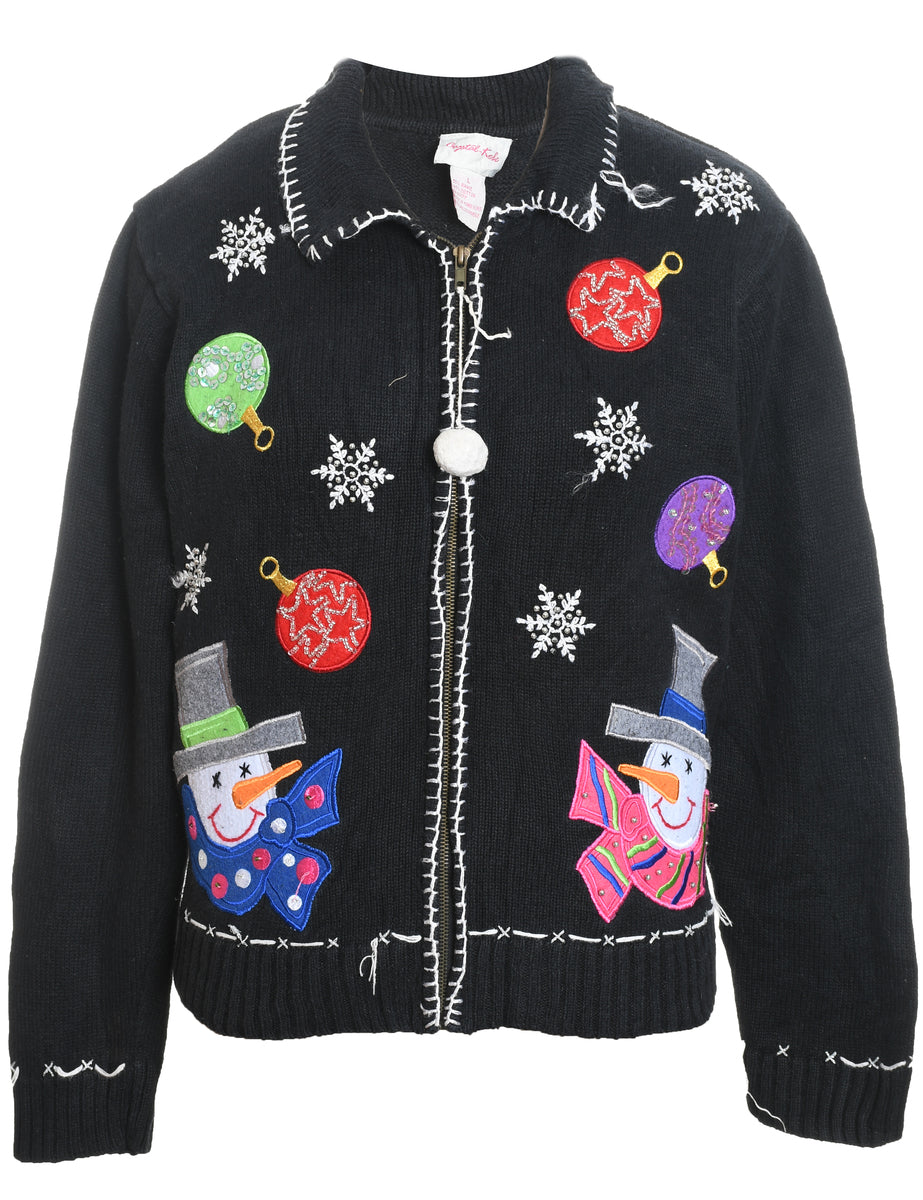 Snowman Design Black Embroidered Zip-Front Christmas Cardigan - L