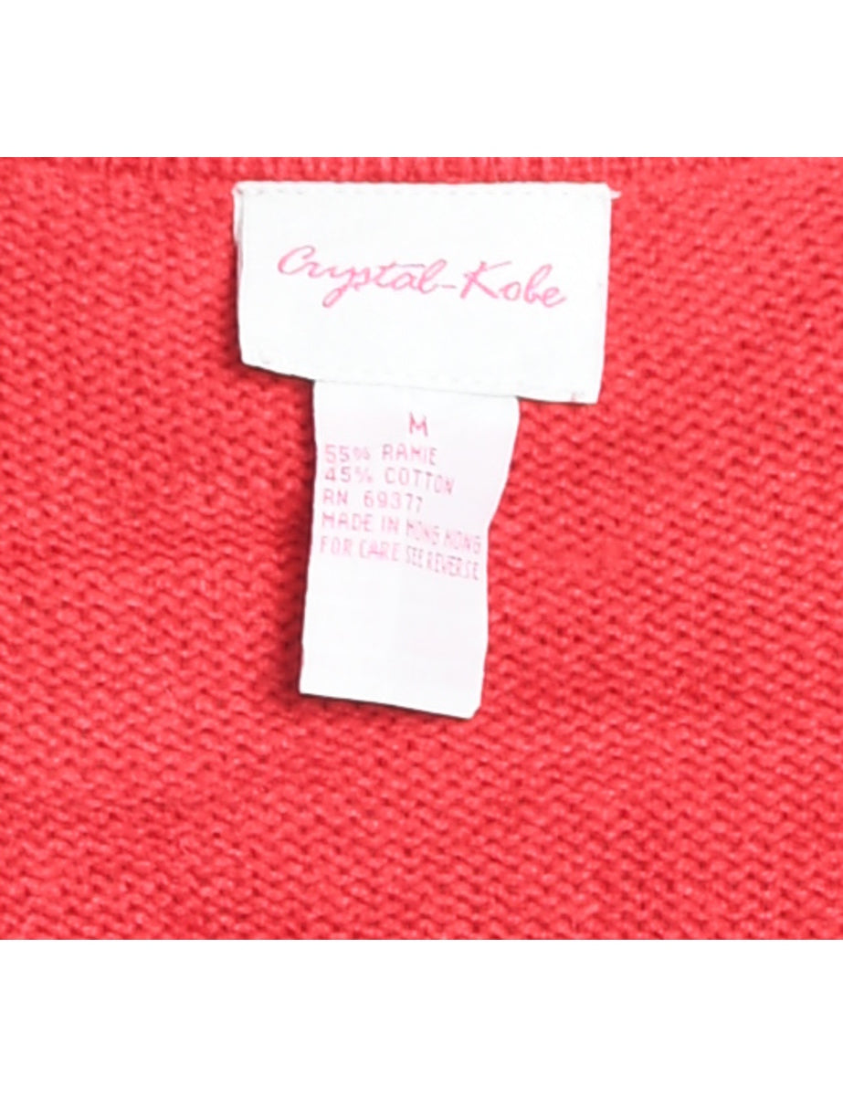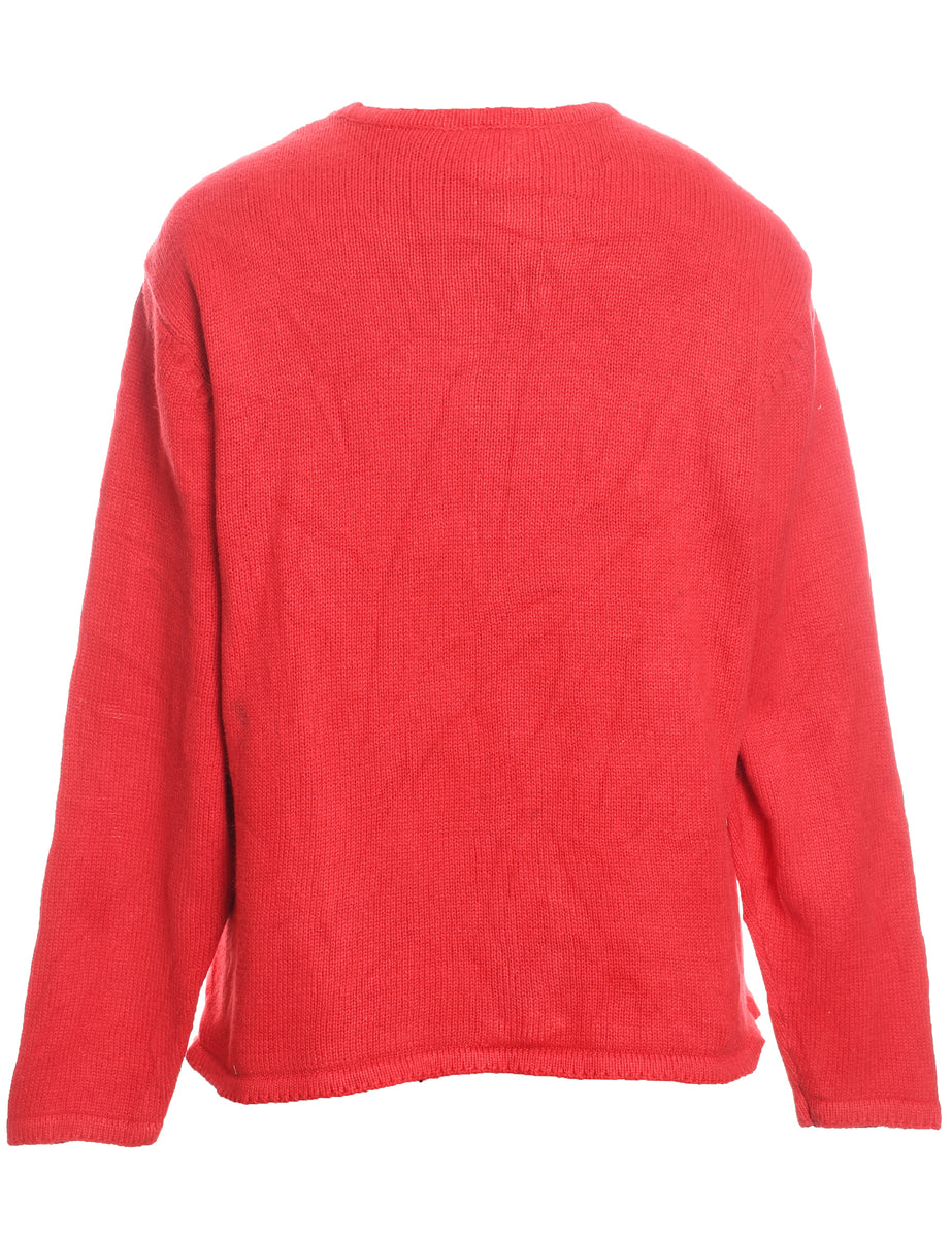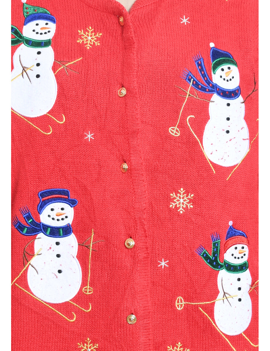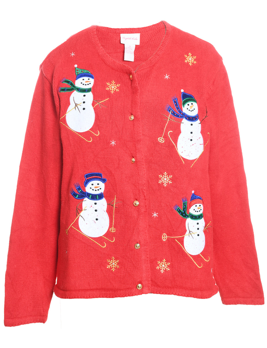 Snowman Design Red Appliqued Knit Christmas Cardigan - M