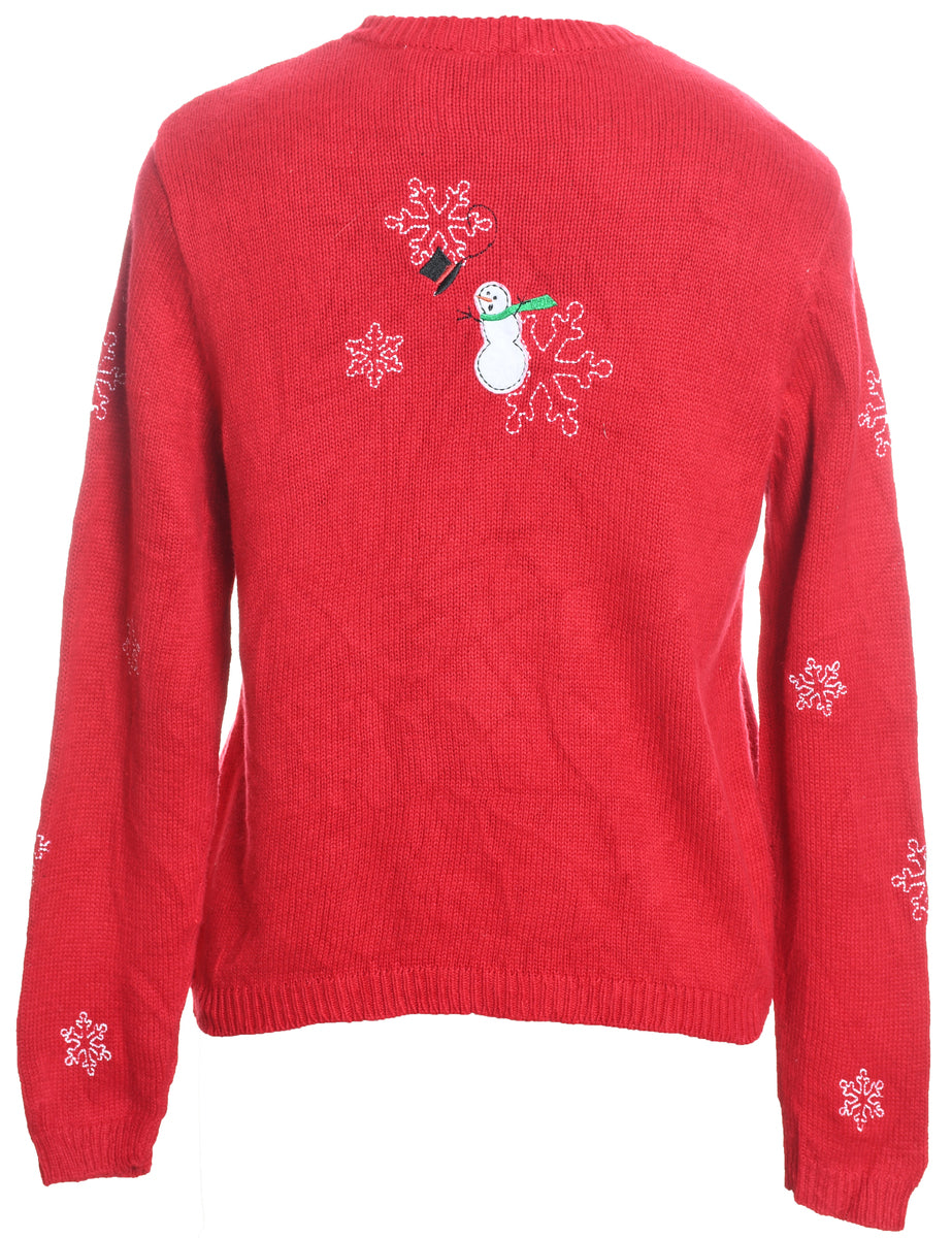 Snowman design red embroidered Christmas cardigan complete with an applique design and a drop shoulder.