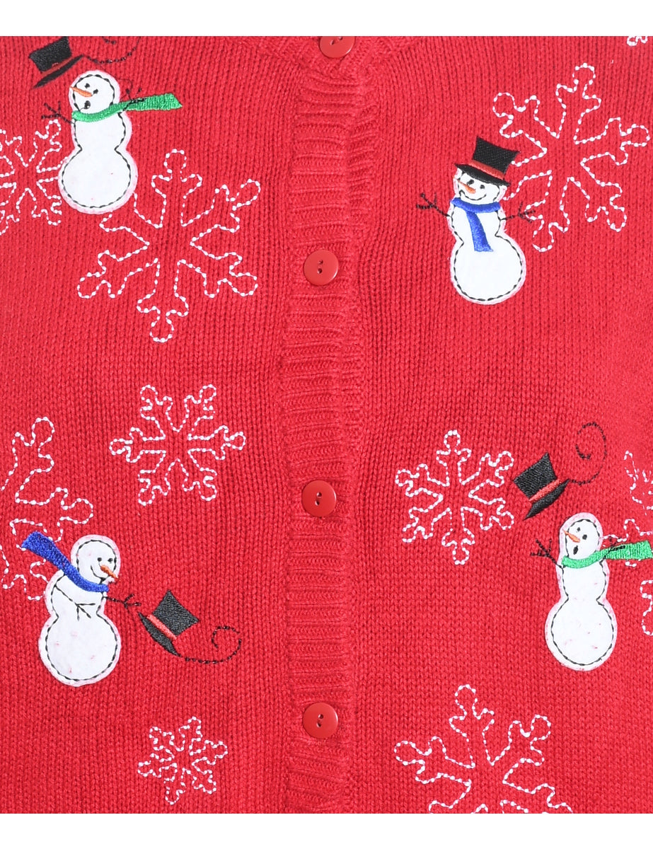 Snowman Design Red Embroidered Christmas Cardigan - M