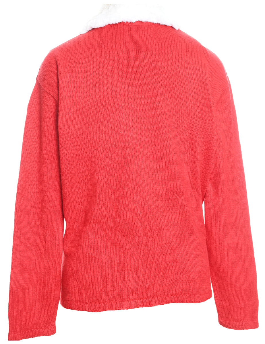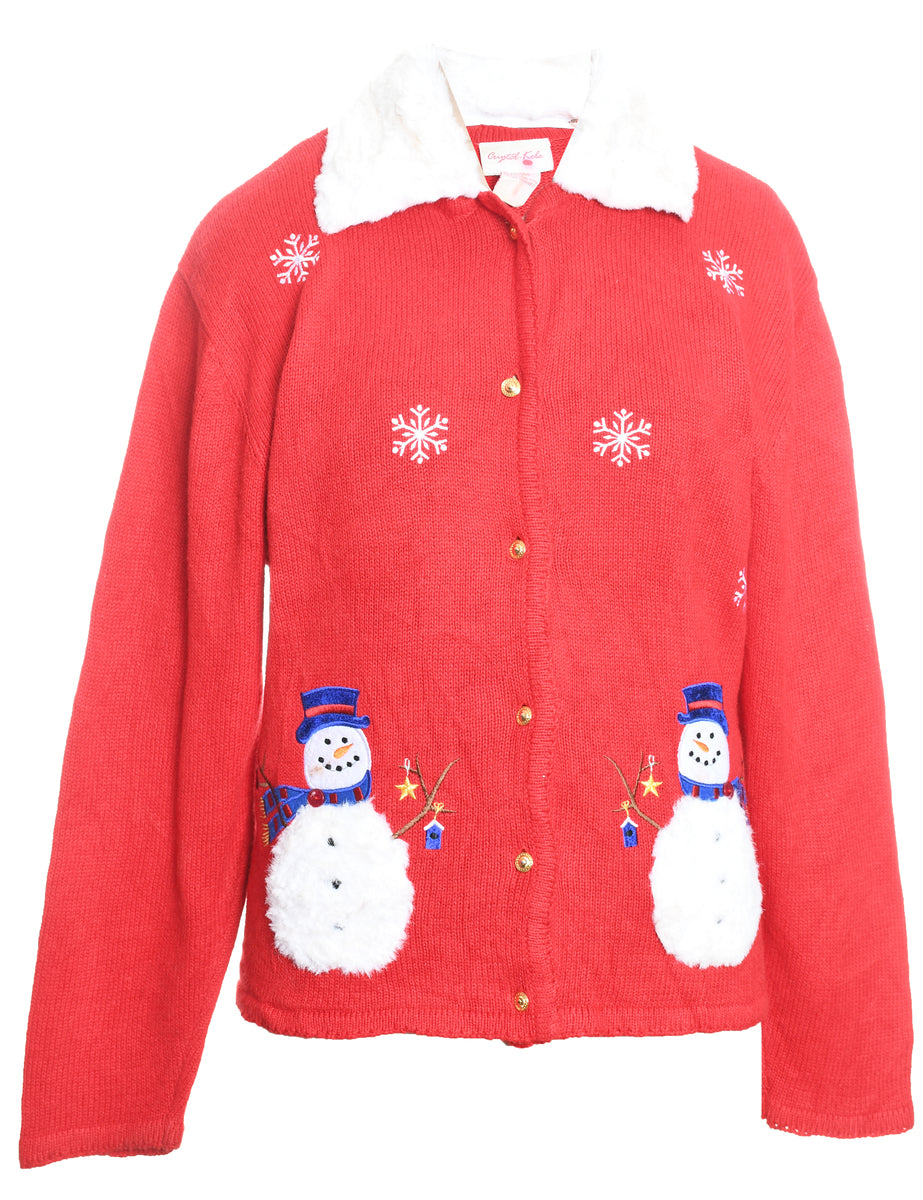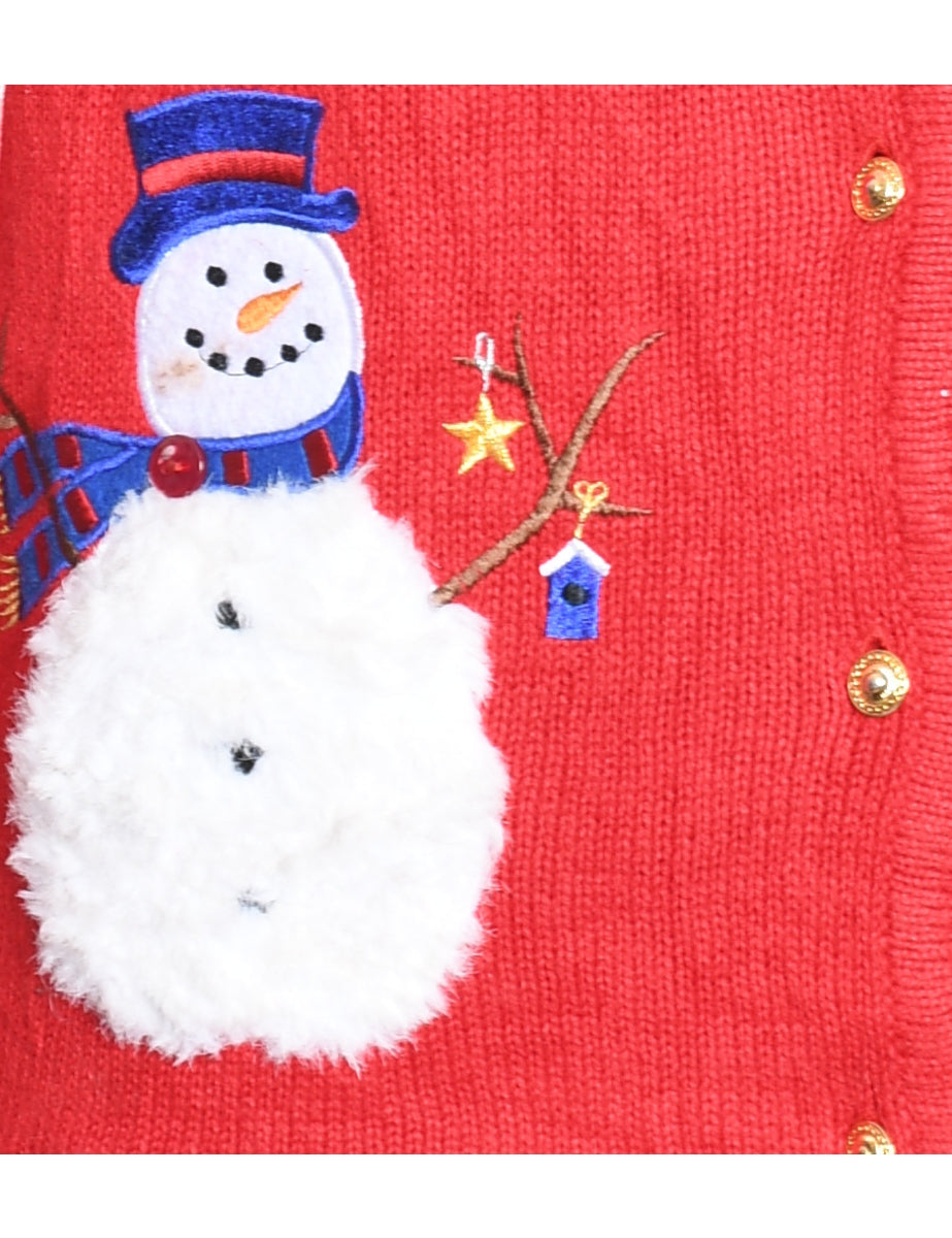 Snowman Design Red Faux Fur Collar Christmas Cardigan - L