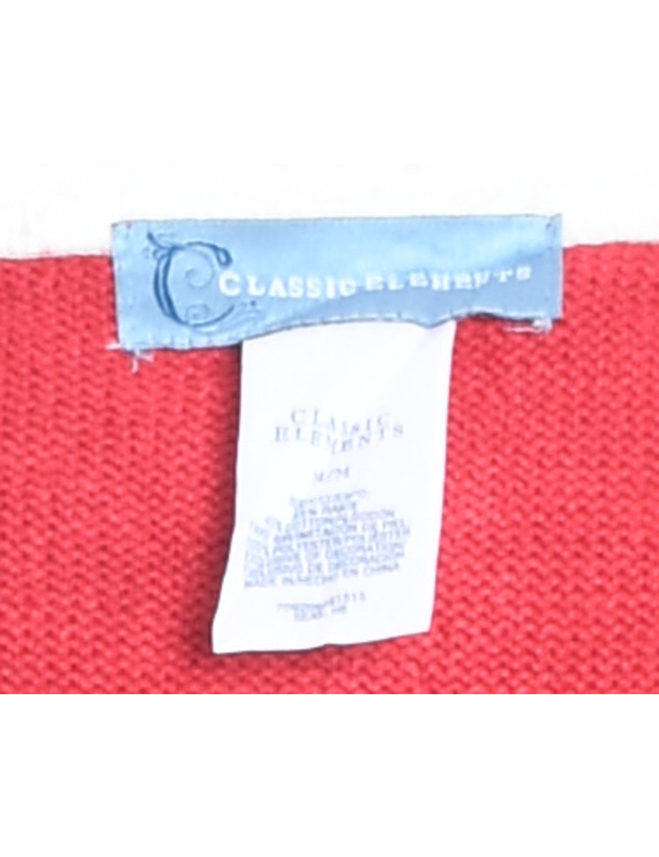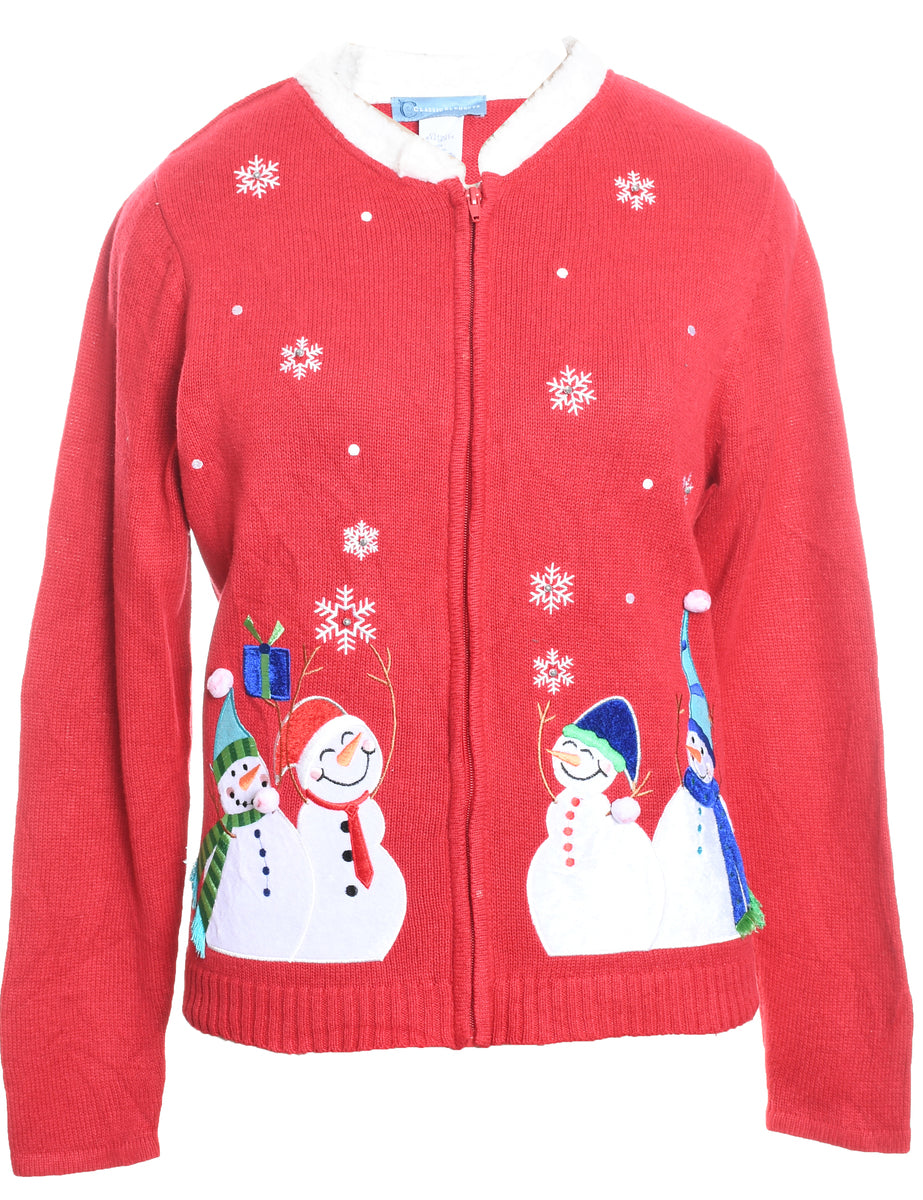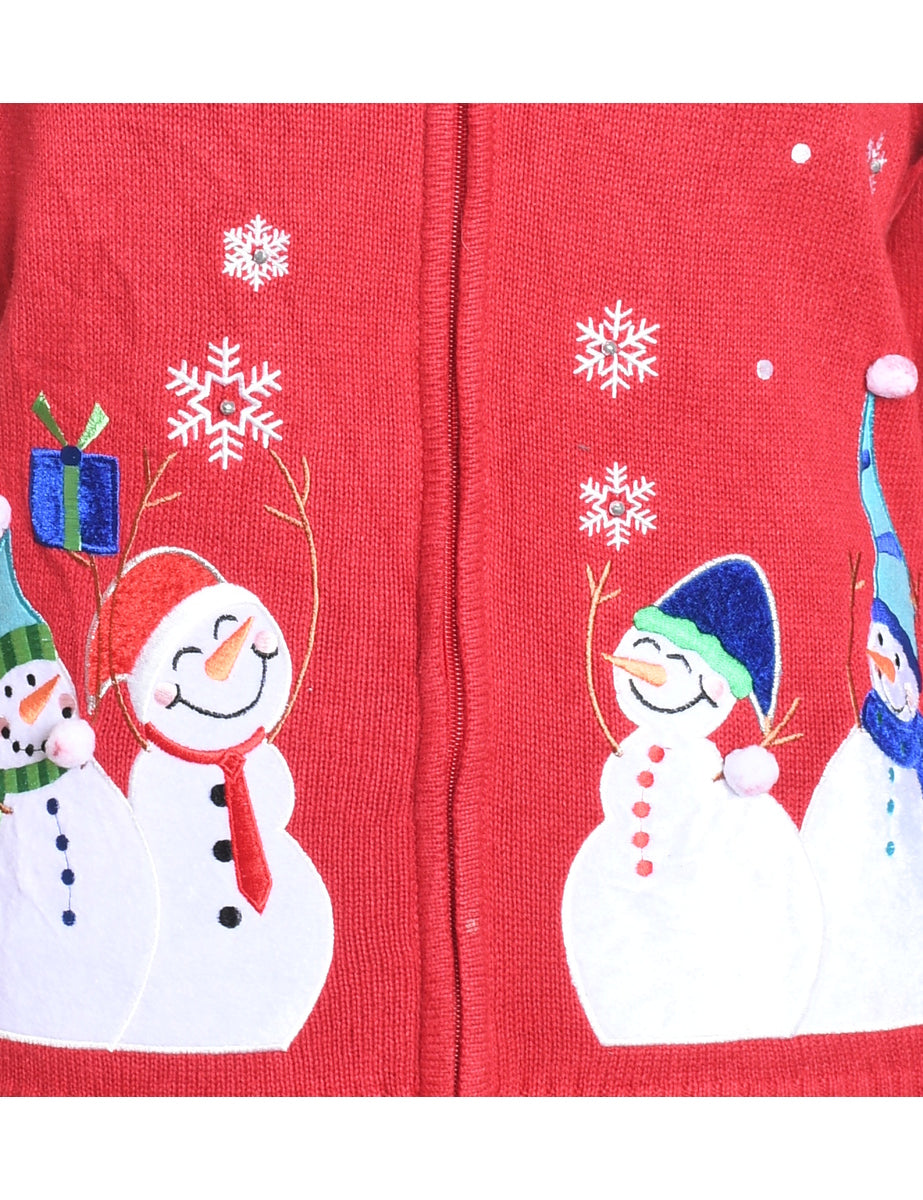 Snowman Design Red Zip-Front Embroidered Christmas Cardigan - M