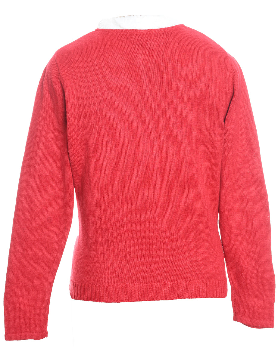 Snowman design red embroidered zip-front Christmas cardigan complete with an applique design.