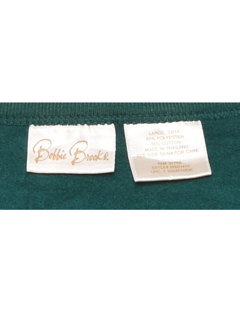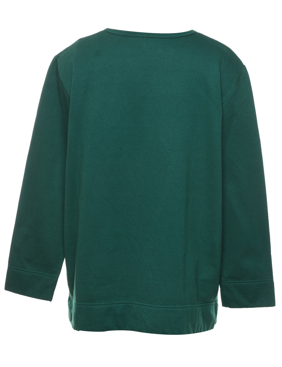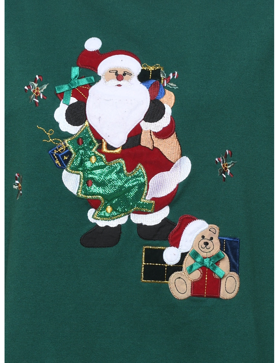 Santa claus christmas sweatshirt comes in green with a round neck and an applique design.
