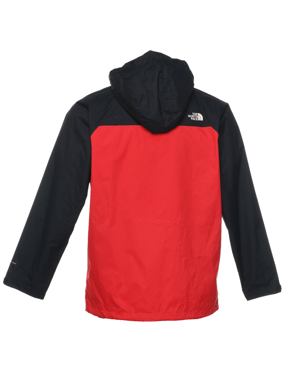 Two tone mountaineering jacket in black & red with a hood and multiple pockets.
