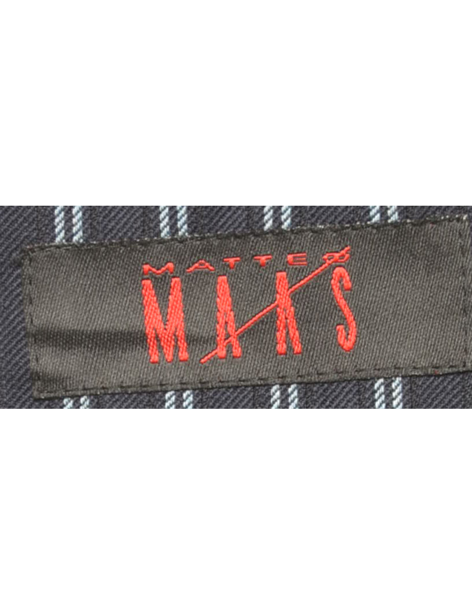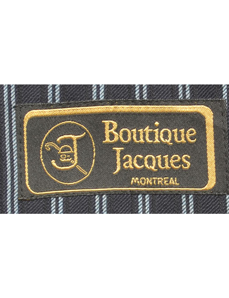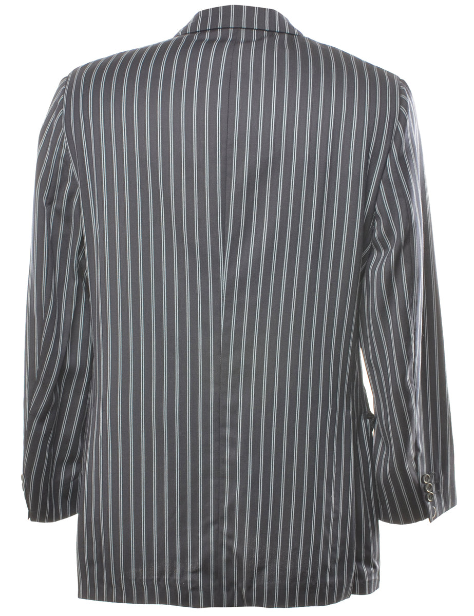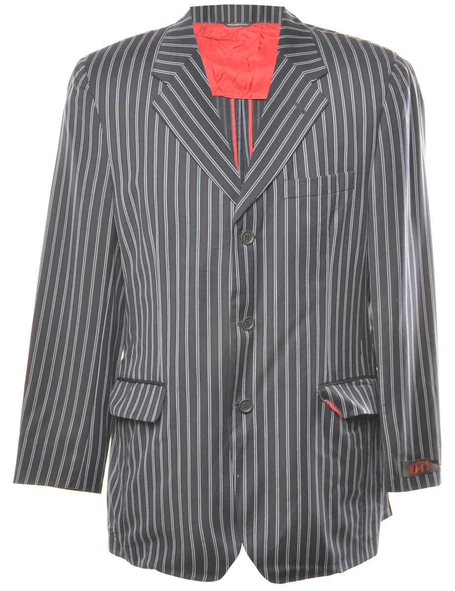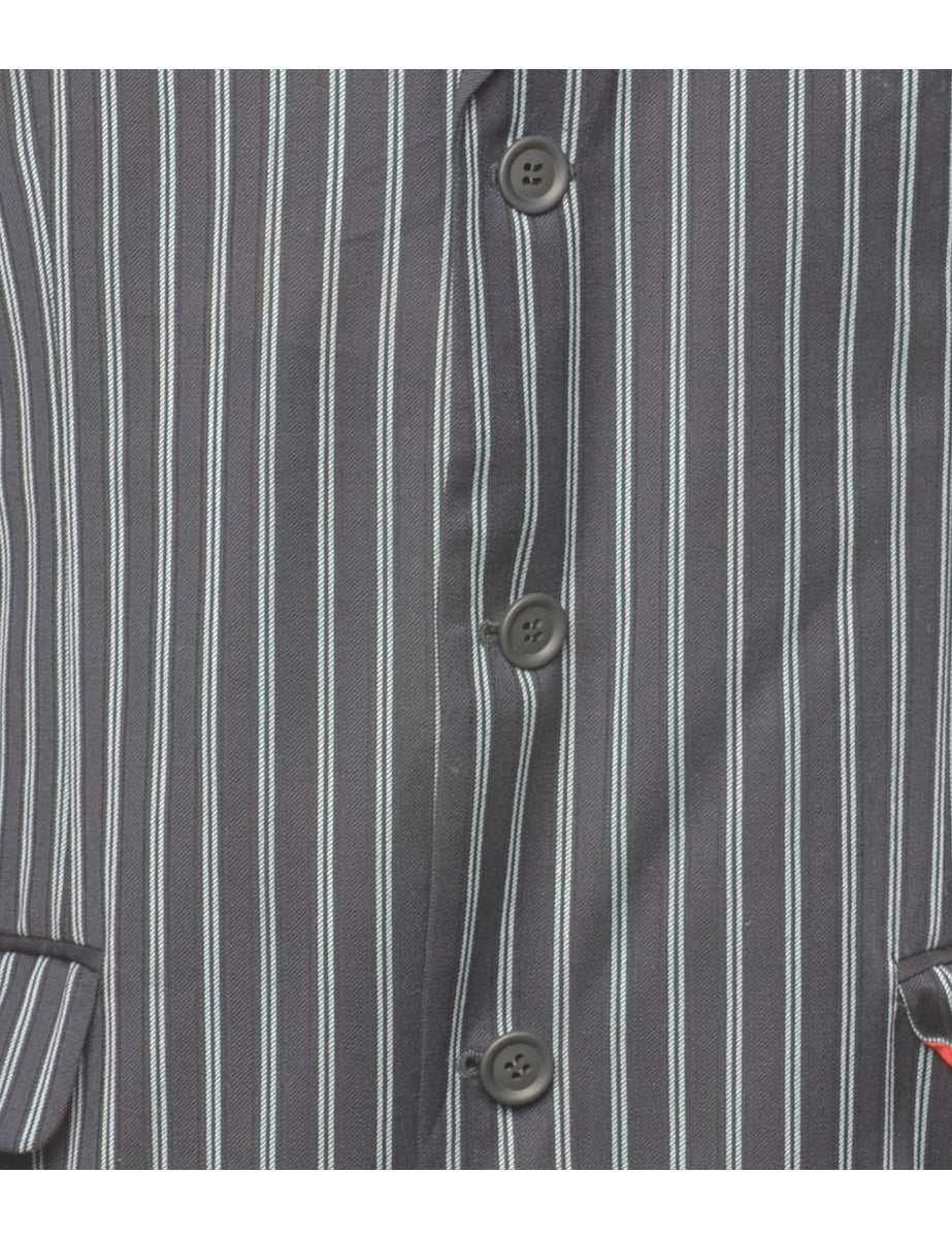 Black striped blazer complete with multiple pockets and built-in shoulder pads.