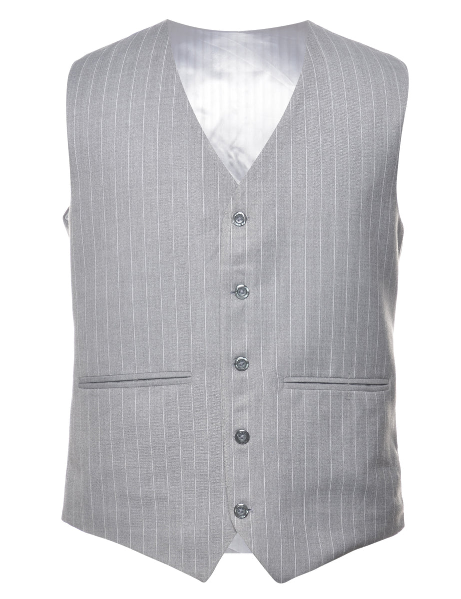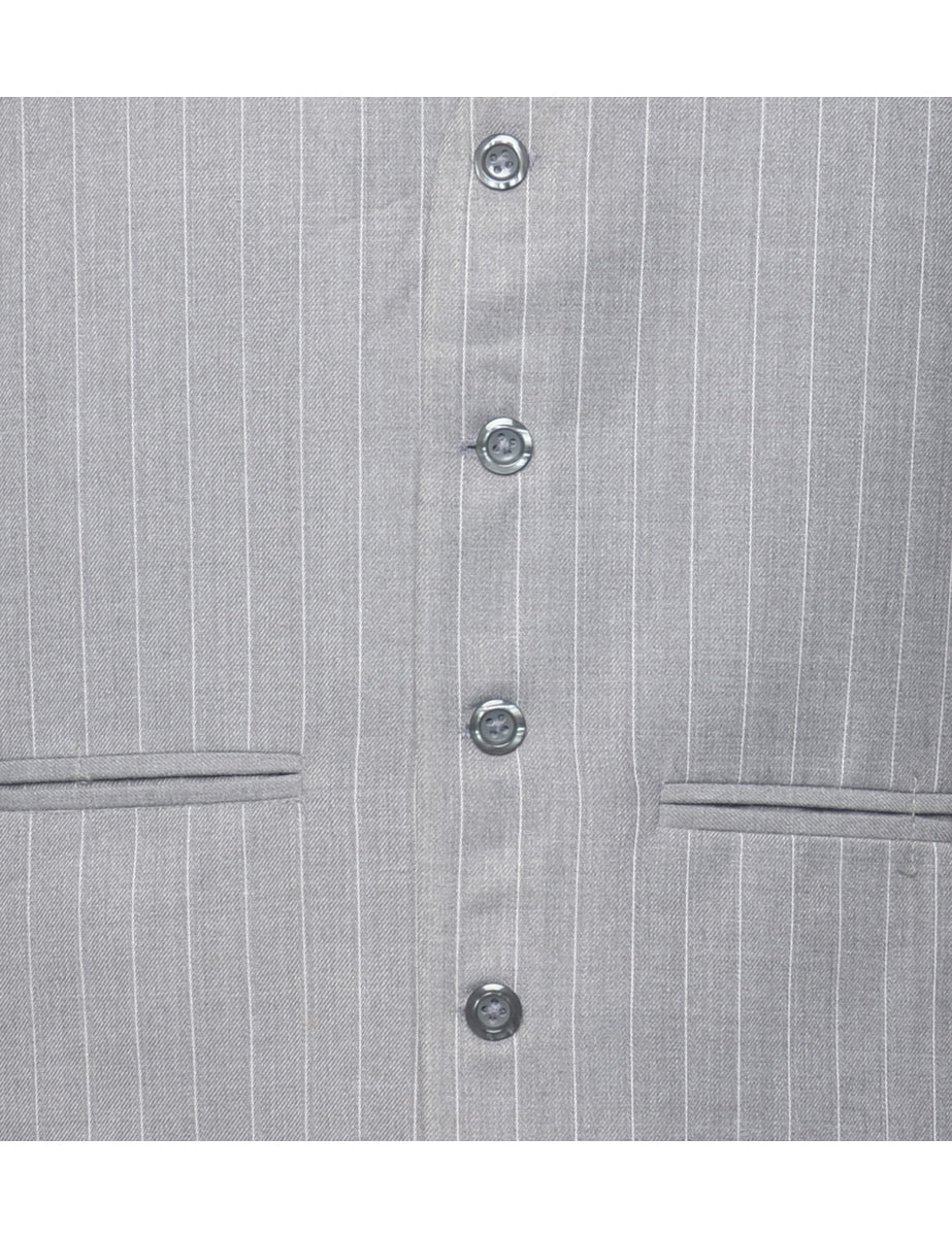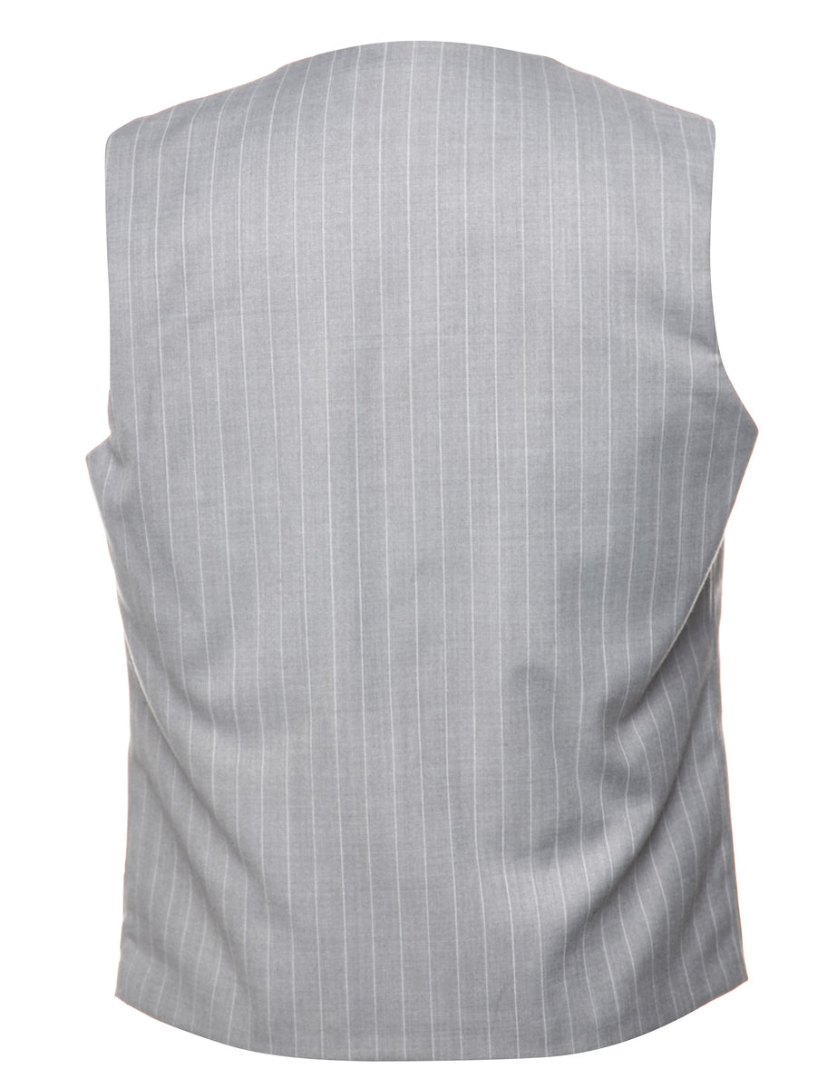 Pinstriped waistcoat in grey with full lining and multiple pockets.