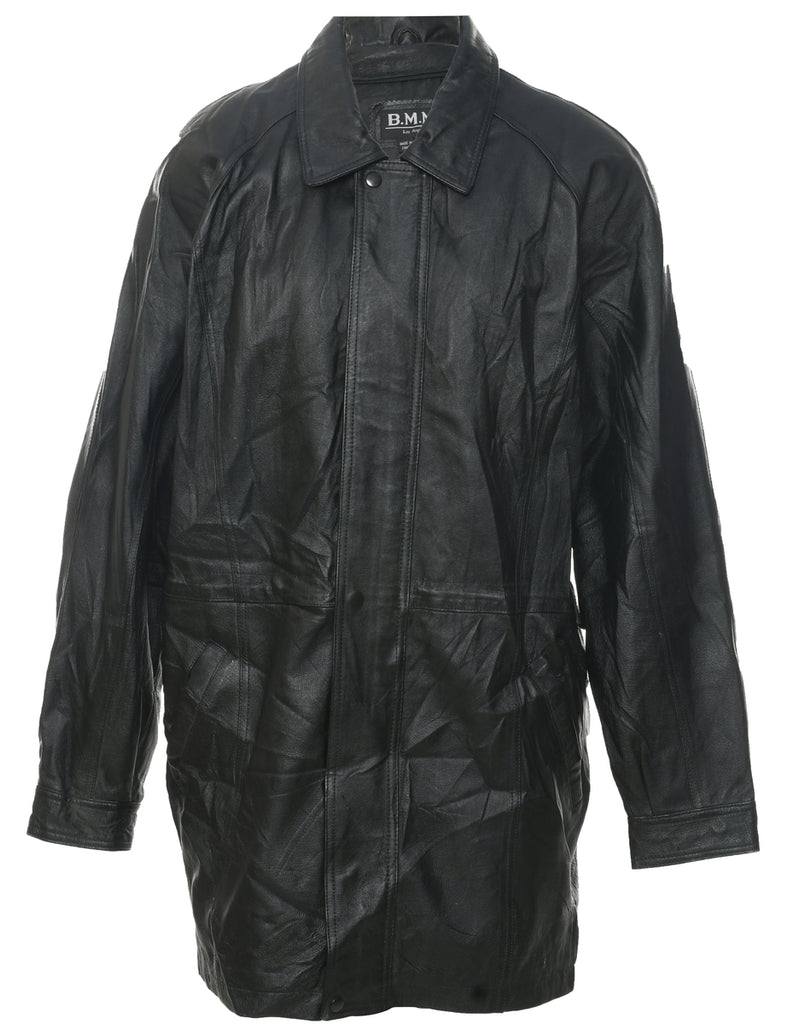 Zip front leather jacket in black with multiple pockets and shoulder pads. The size label mentions S but based on the actual measurements we consider it a size L.