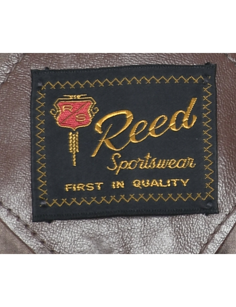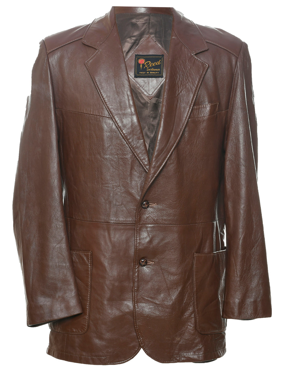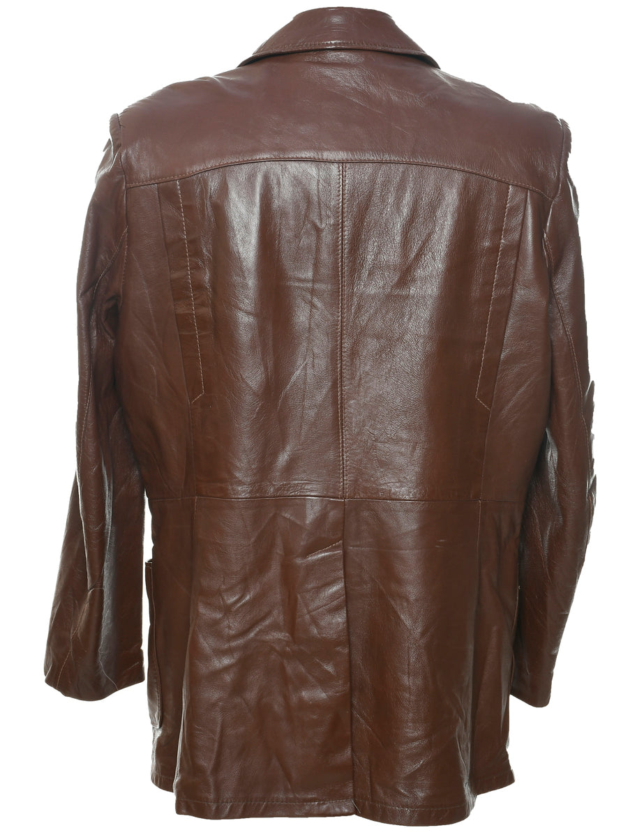 Button front leather jacket in brown with multiple pockets and shoulder pads.