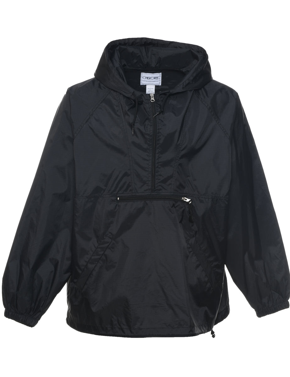 Quarter zip anorak comes in black with multiple pockets and raglan sleeves.