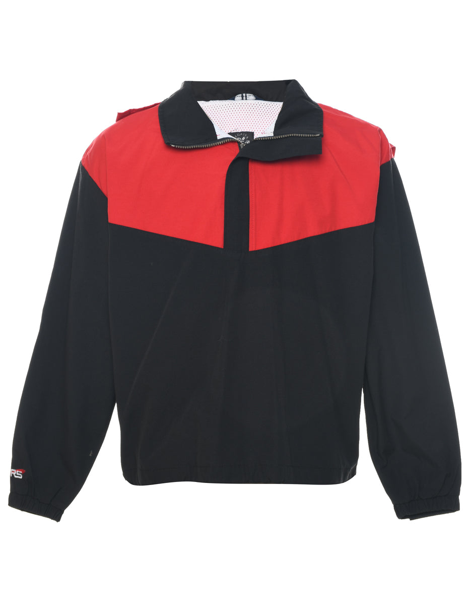 Quarter zip anorak in black & red with a hood and multiple pockets.