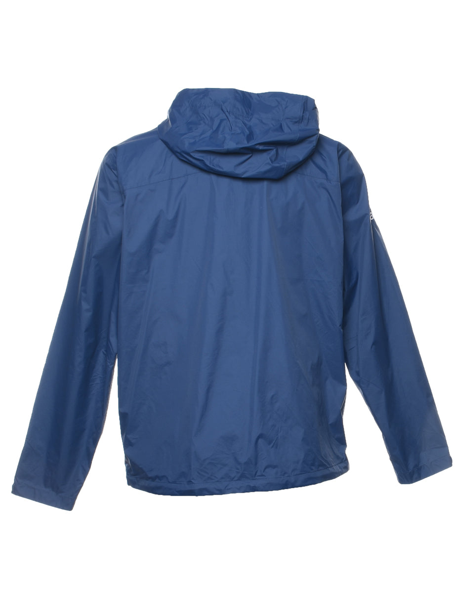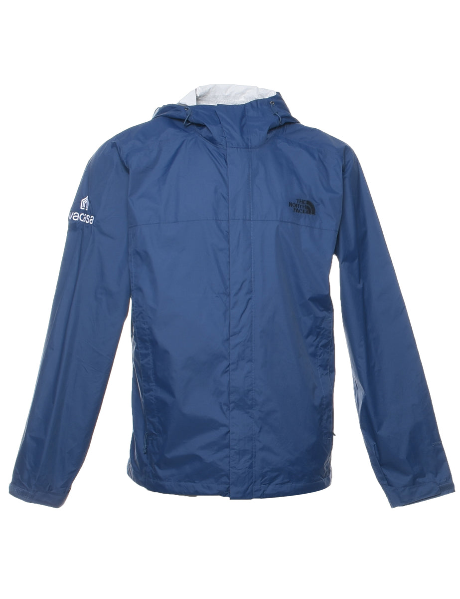 The North Face zip front jacket in navy with a hood and multiple pockets.