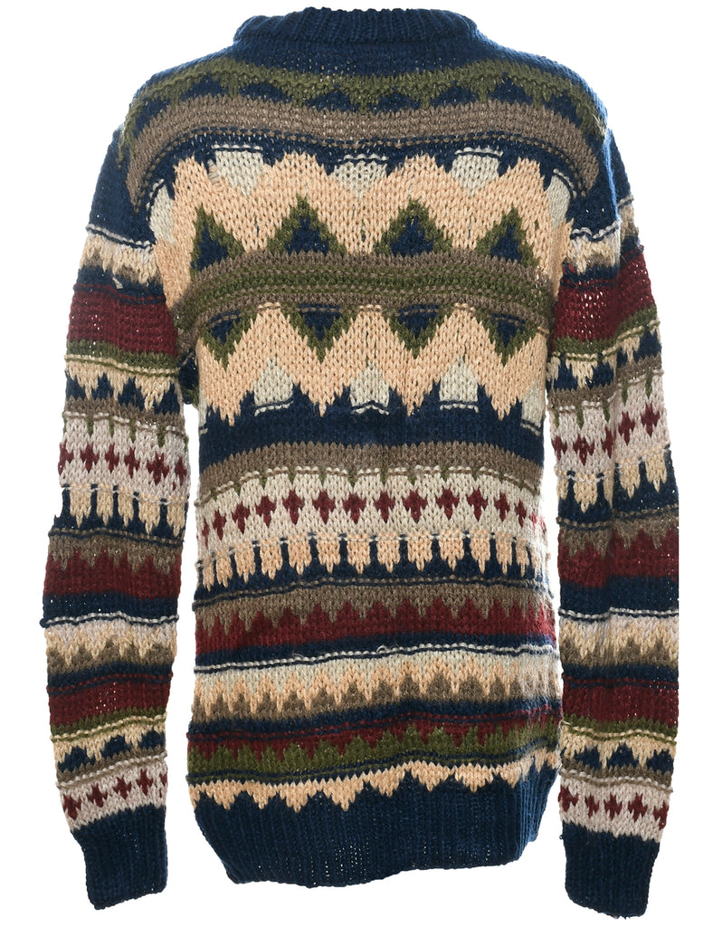 Geometric pattern jumper in multi-colour with a crew neck and a drop shoulder.