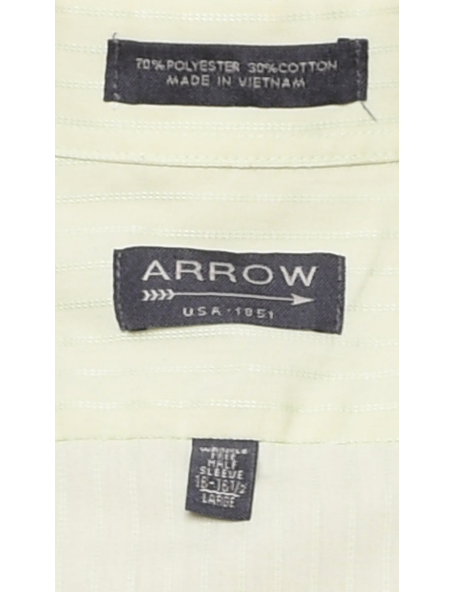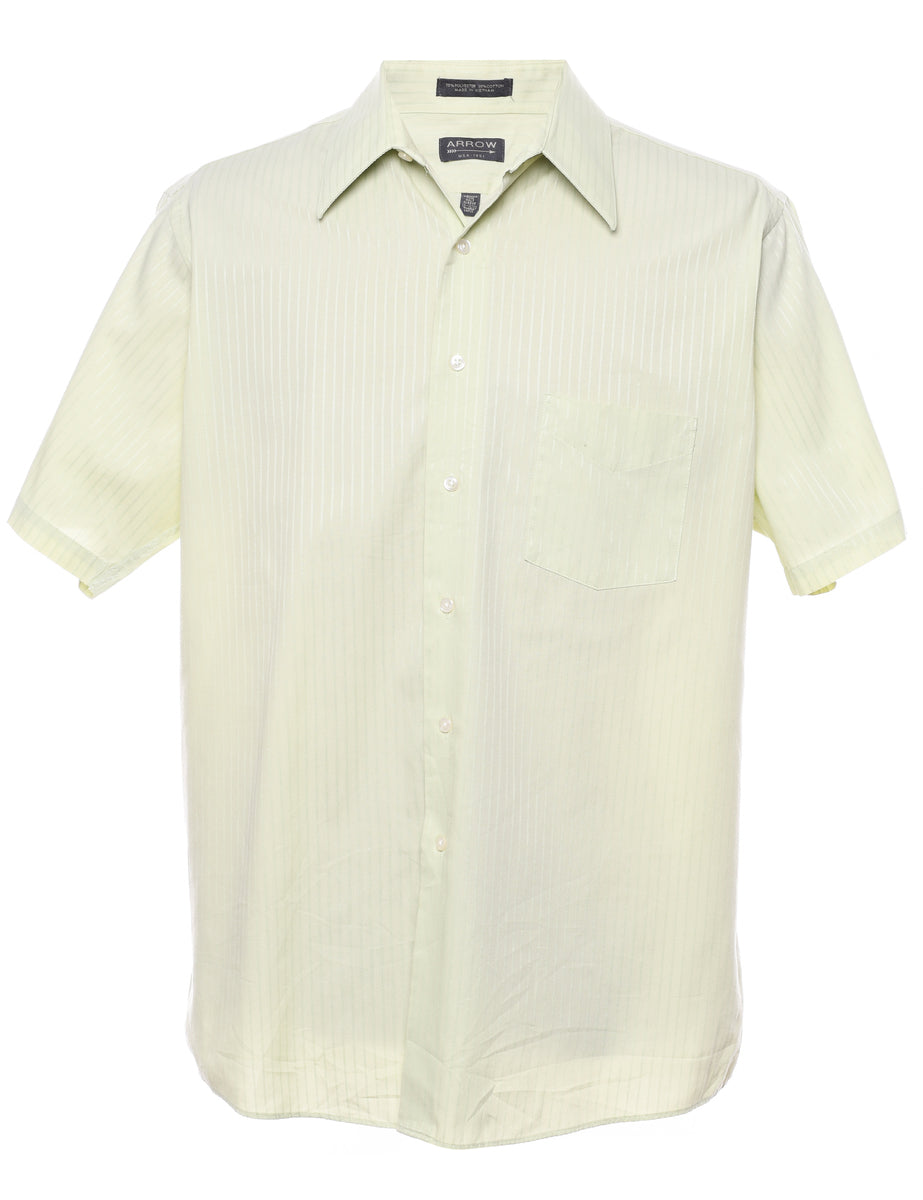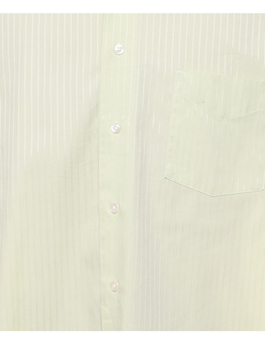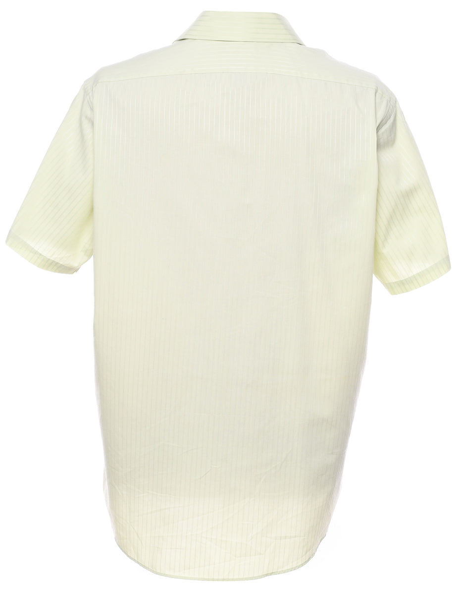 Striped short sleeved shirt in green with a classic collar and one pocket.