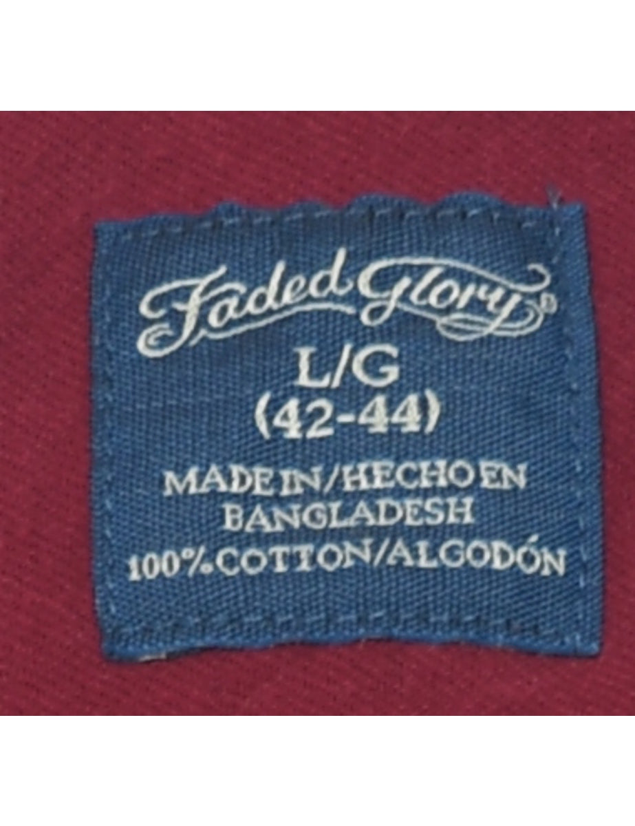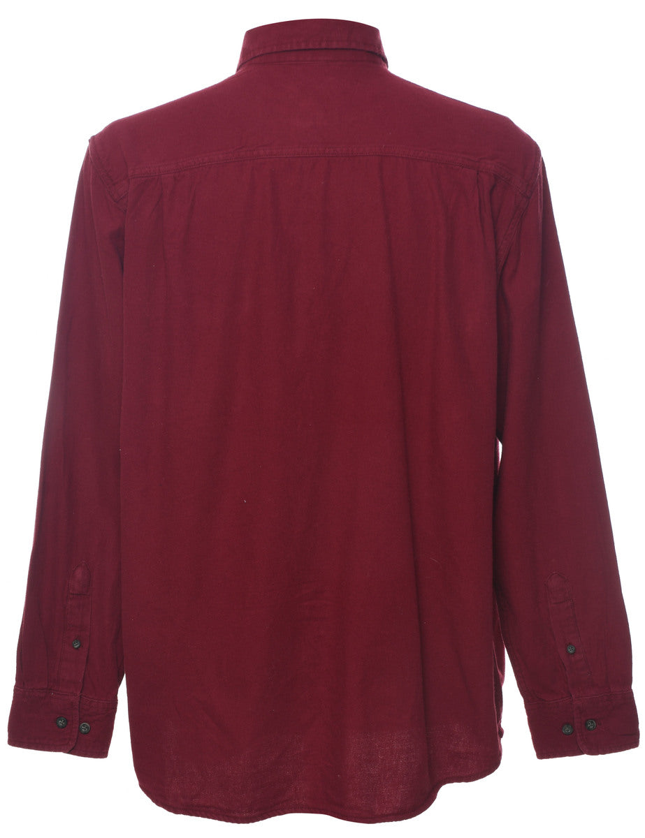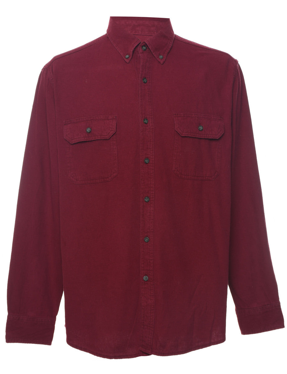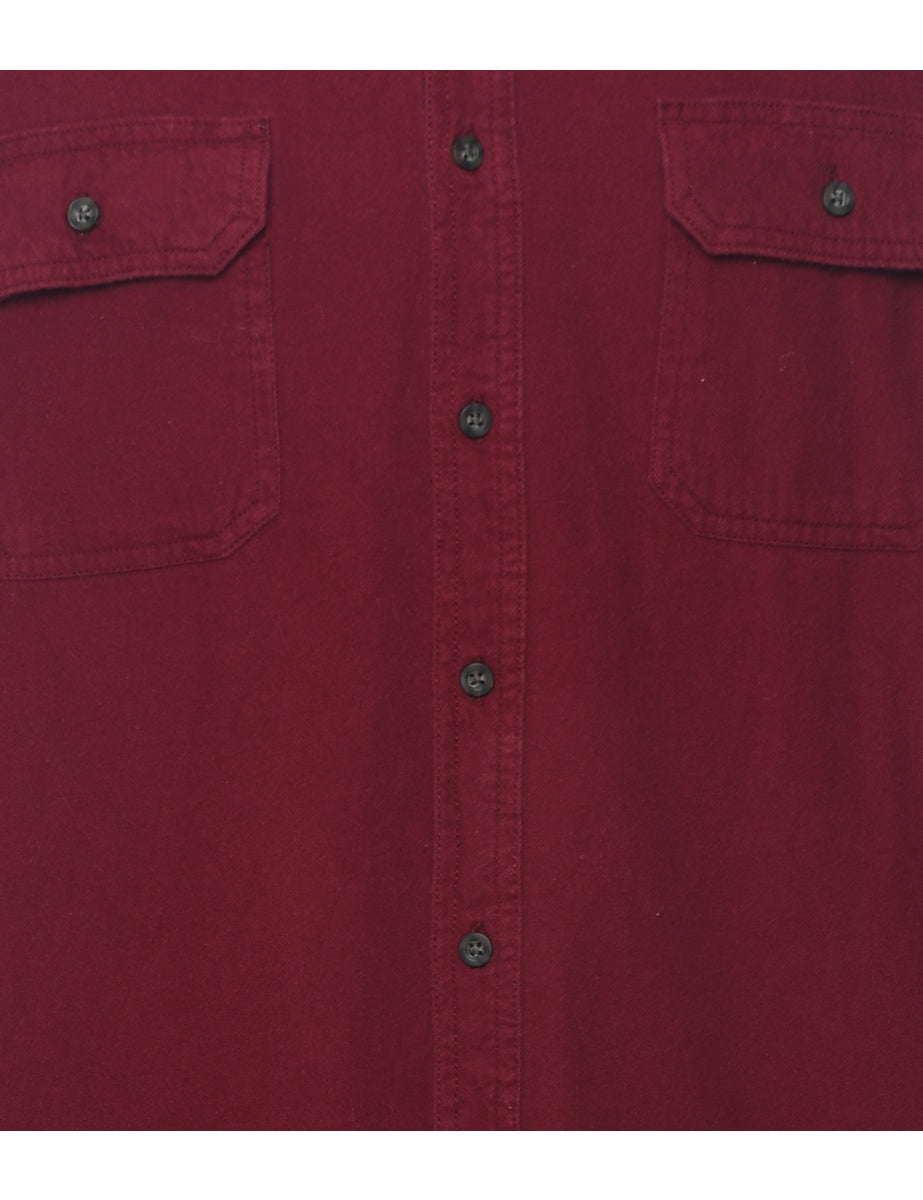 Long sleeved maroon flannel shirt with a classic collar and pockets.