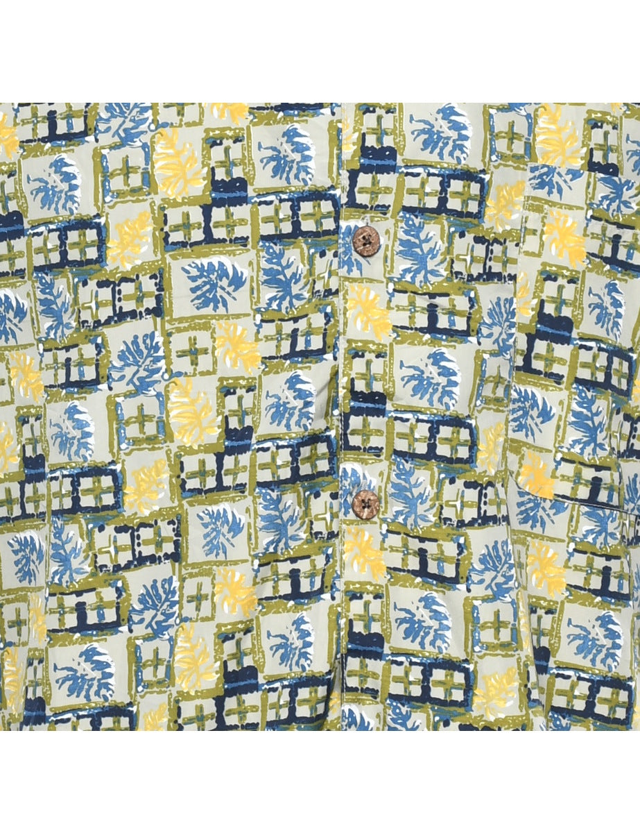 Bill Blass multi-coloured leafy print Hawaiian shirt with coconut buttons and one pocket.
