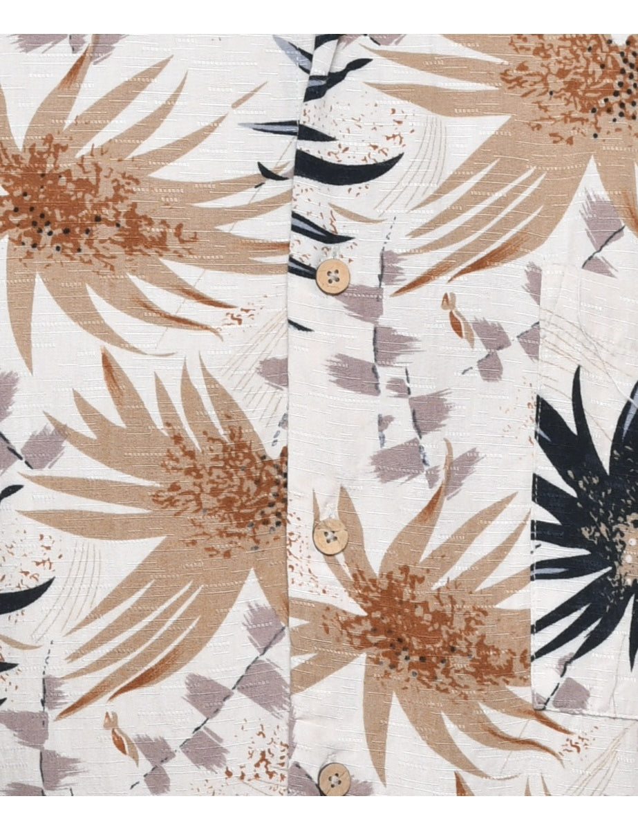 Black & light brown leaf print short sleeve shirt with one pocket.