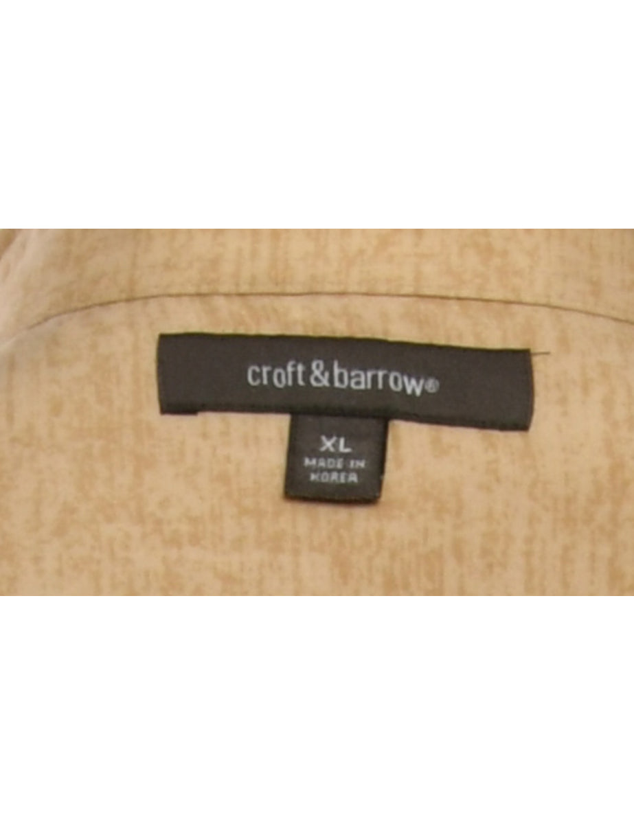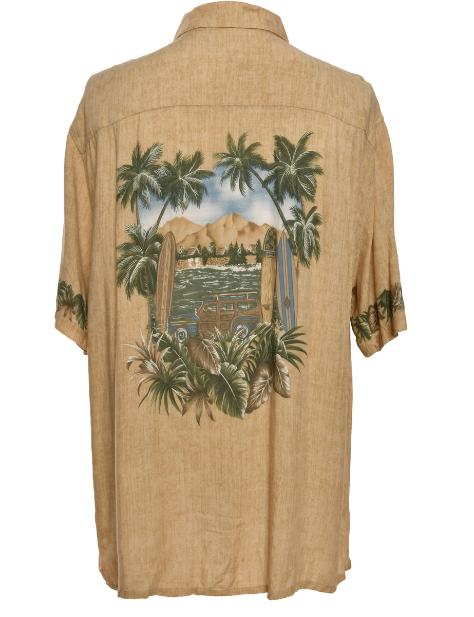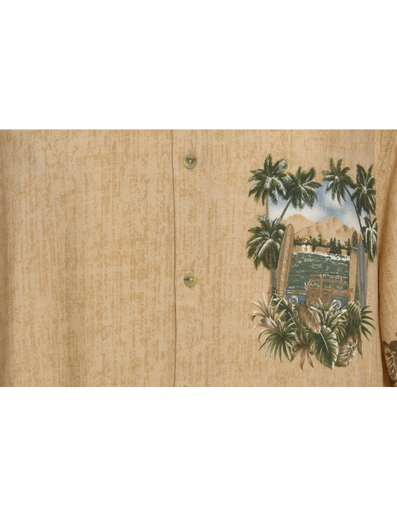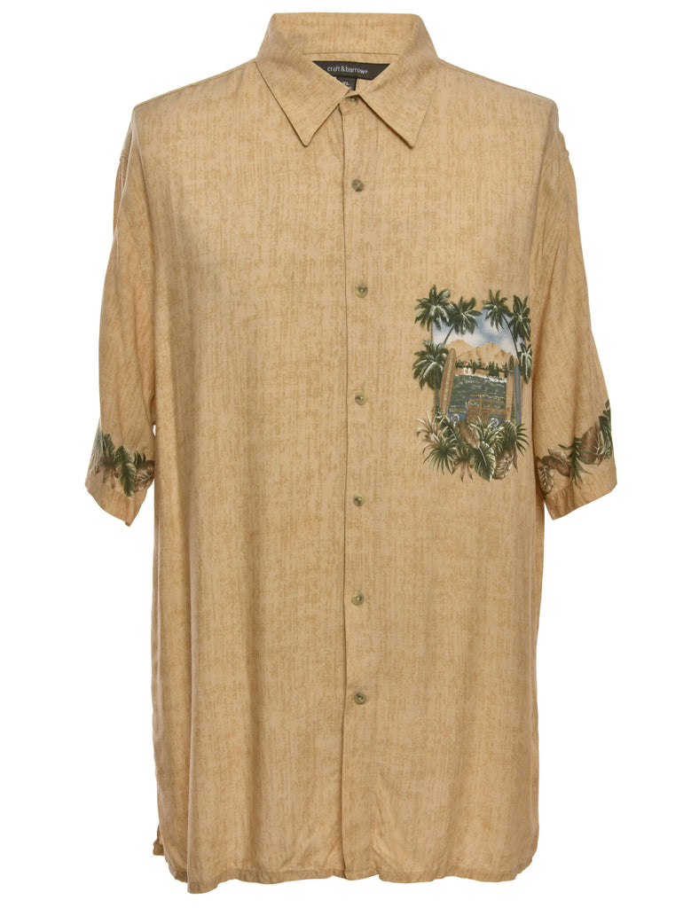 Croft & Barrow beige tropical palm tree Hawaiian shirt with back print.