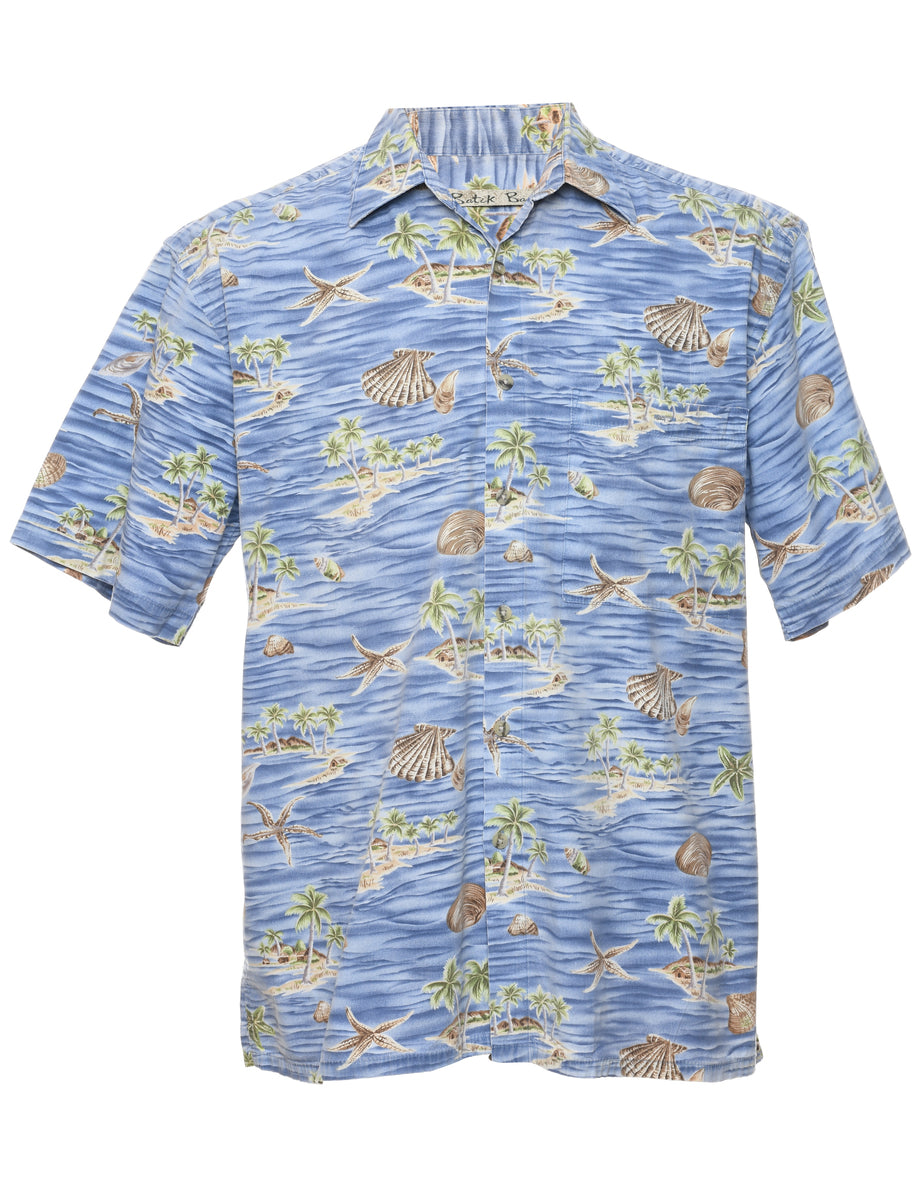 Tropical hawaiian shirt in light blue with a classic collar and one pocket.