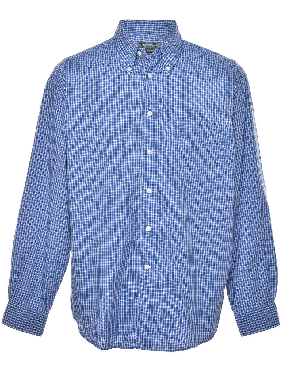 Long sleeved blue Eddie Bauer checked shirt with one pocket.