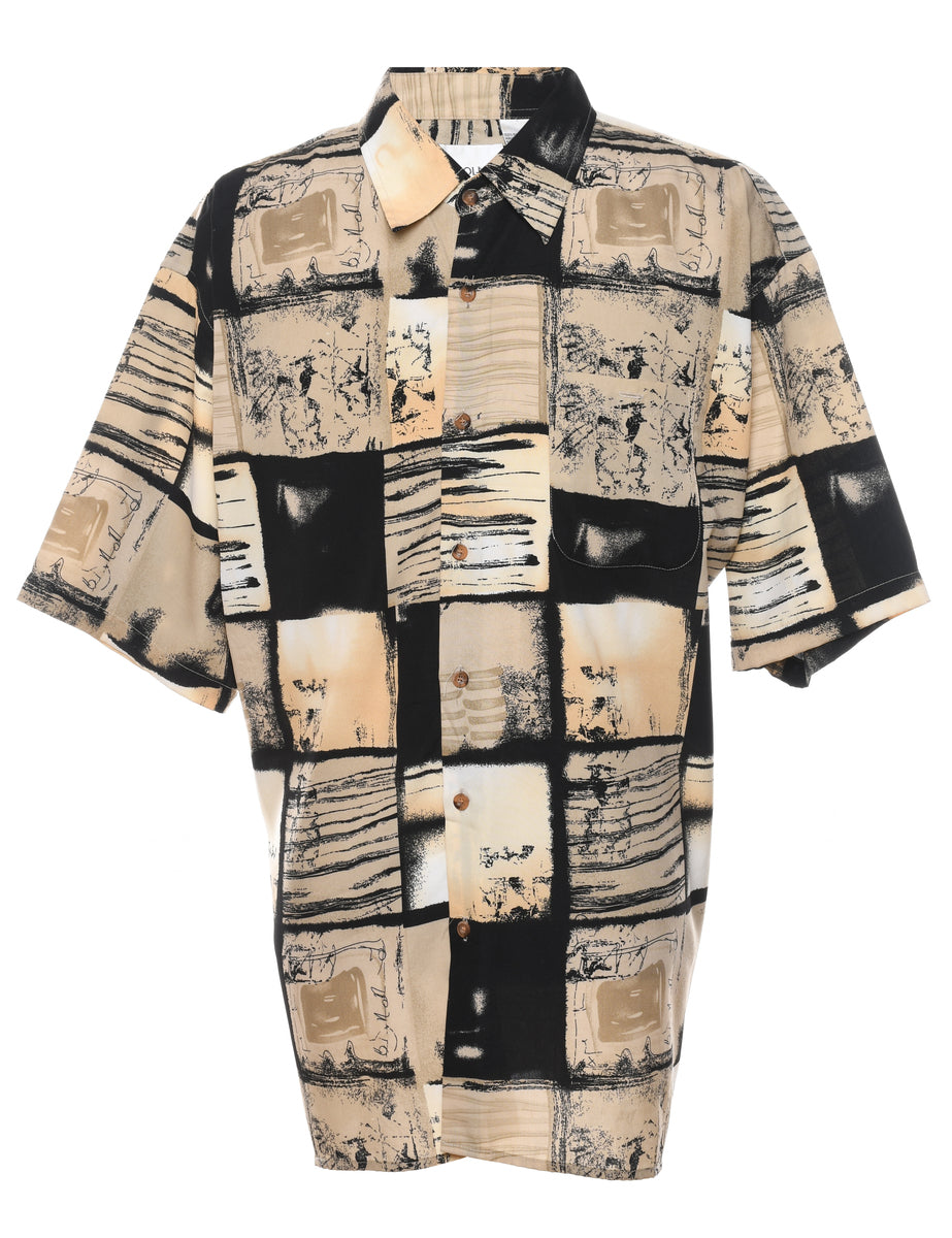 Short sleeve beige & black patterned 1990s shirt complete with a classic collar.