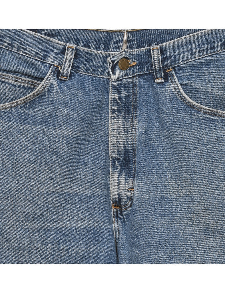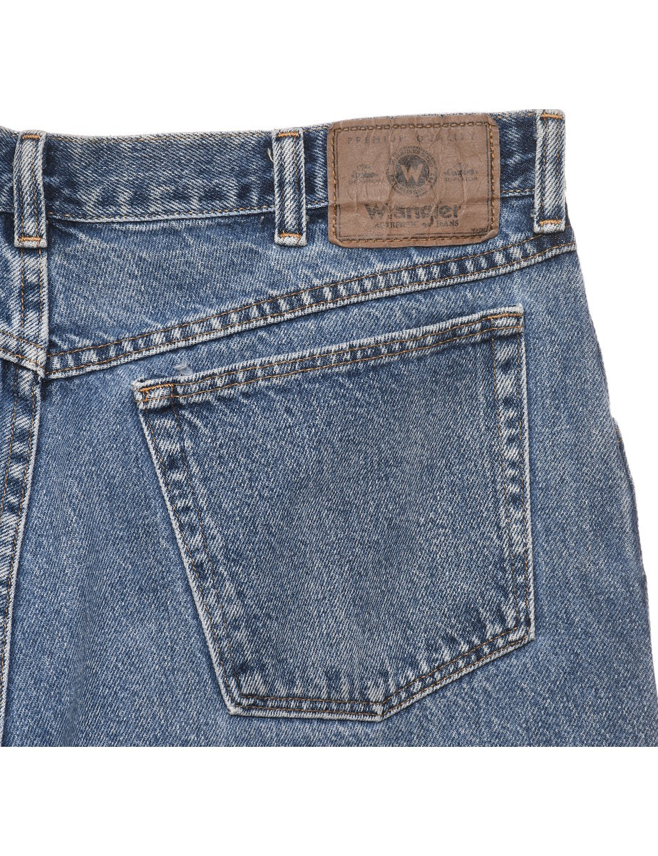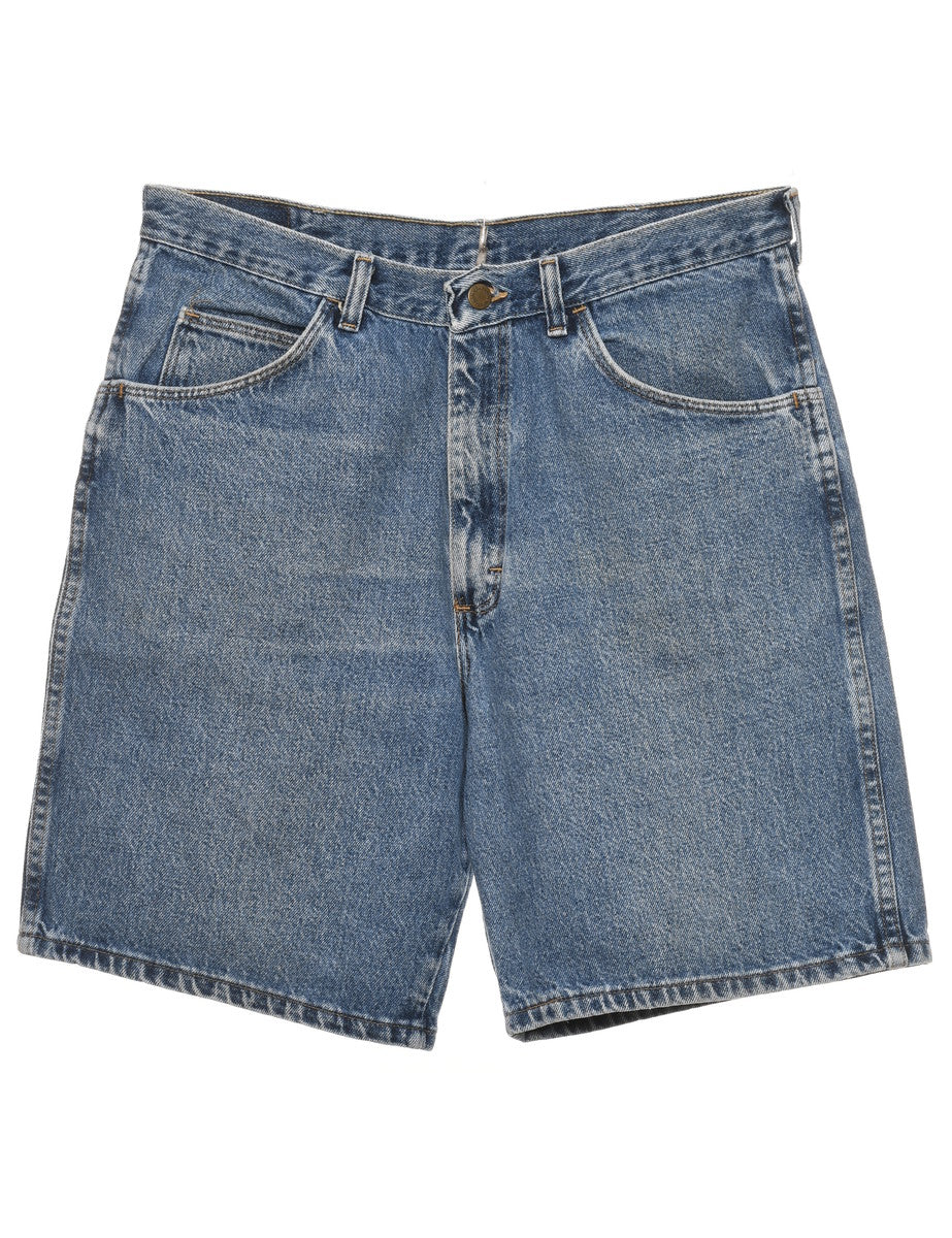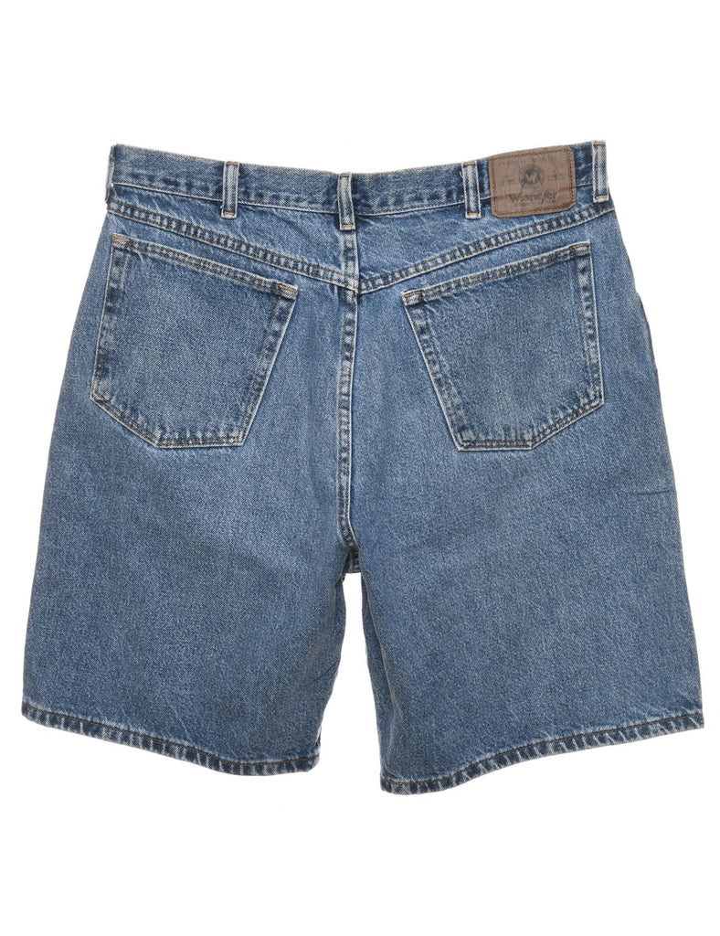 Wrangler denim denim shorts. Comes in faded wash with multiple pockets.