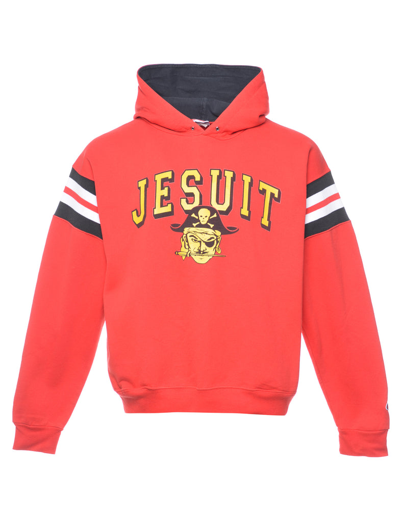 Jesuit printed hoodie in red with two pockets.