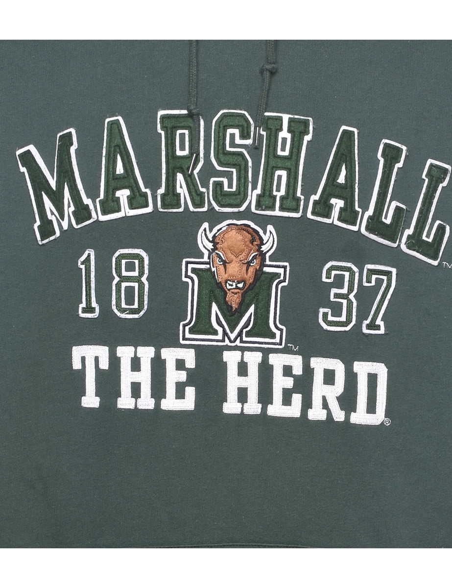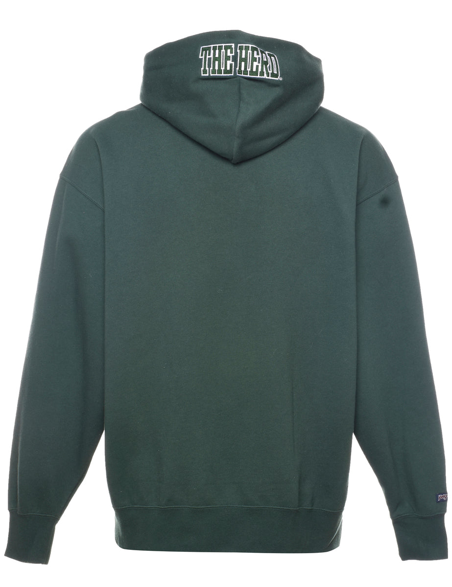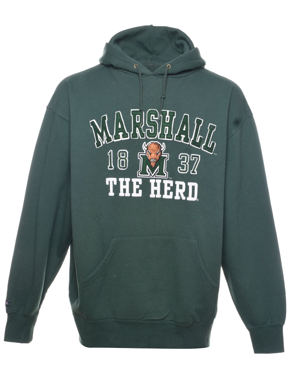 Embroidered dark green marshall printed hoodie with a drop shoulder and a pocket.