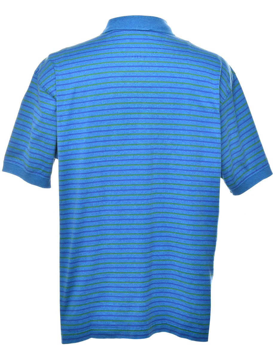 Striped blue polo shirt with one pocket.