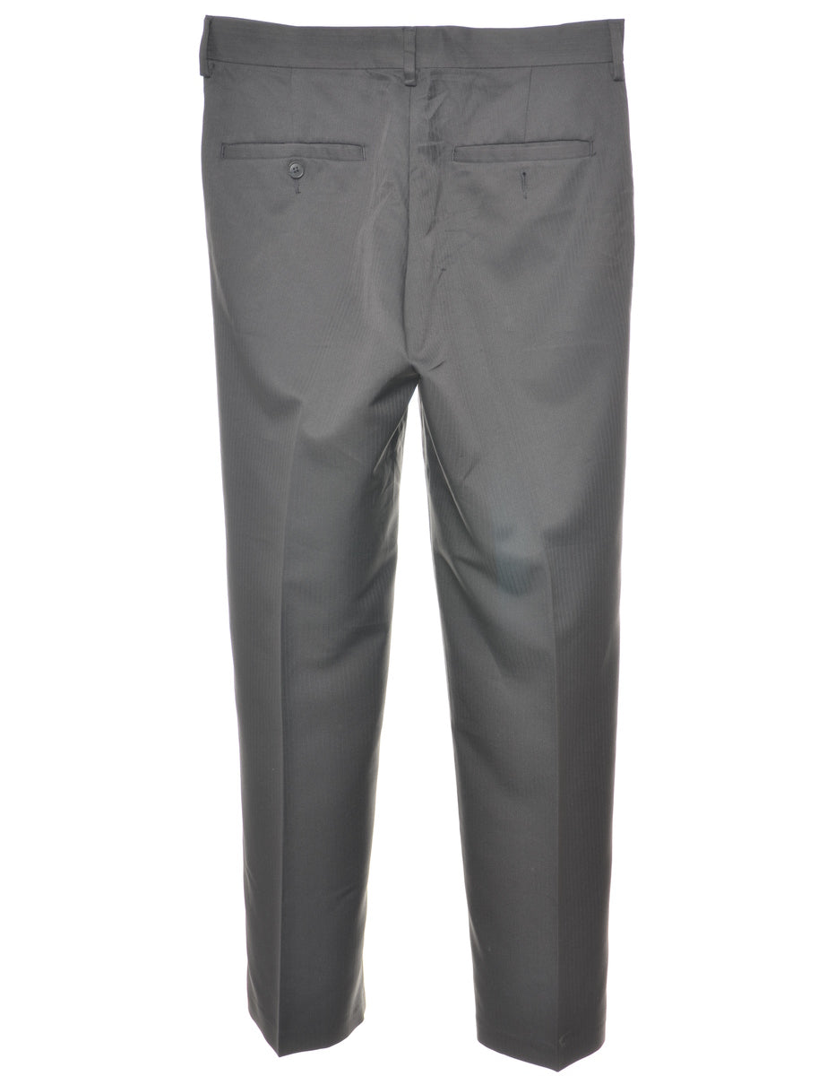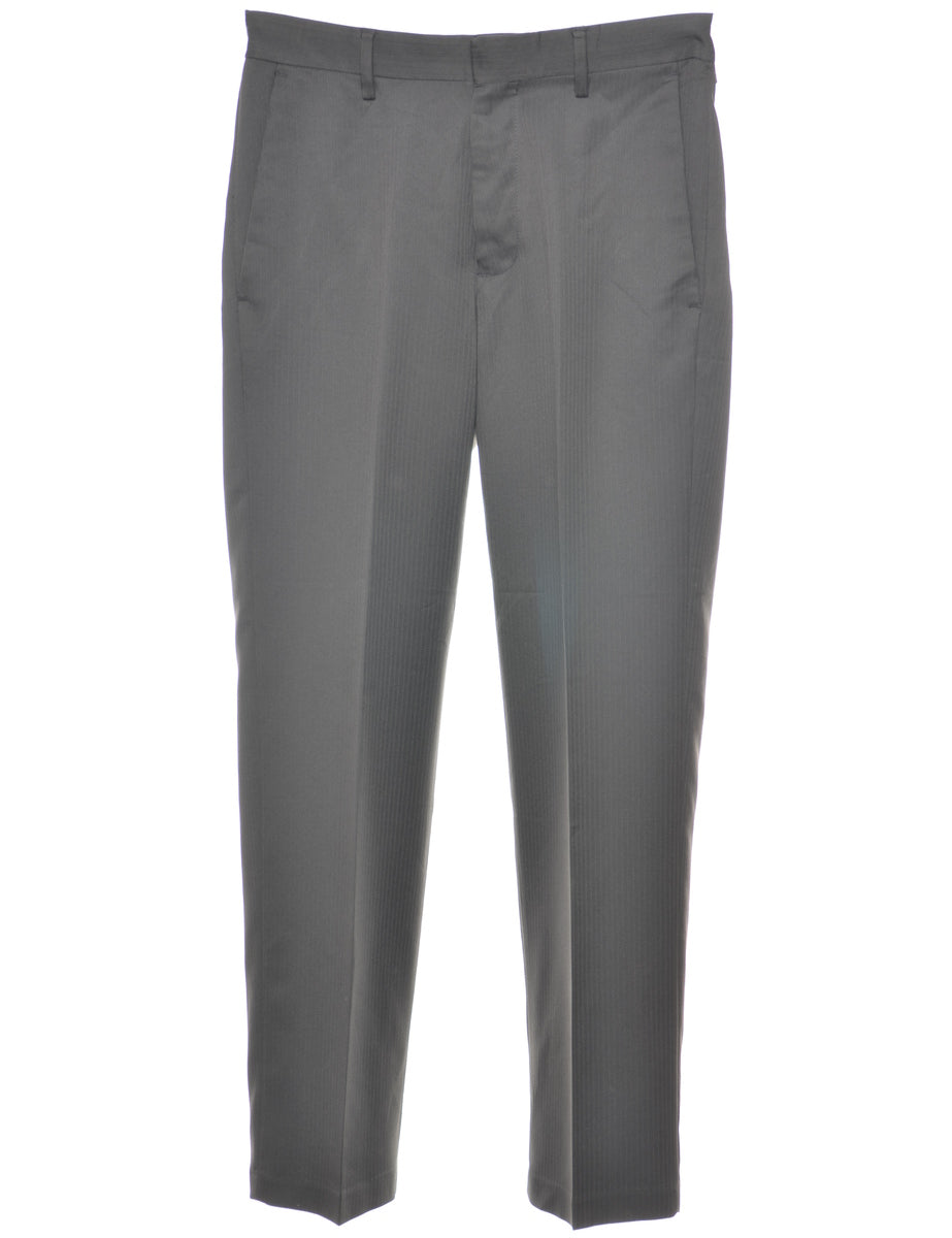 Trousers with pinstripes. Comes in dark grey with belt loops and multiple pockets.