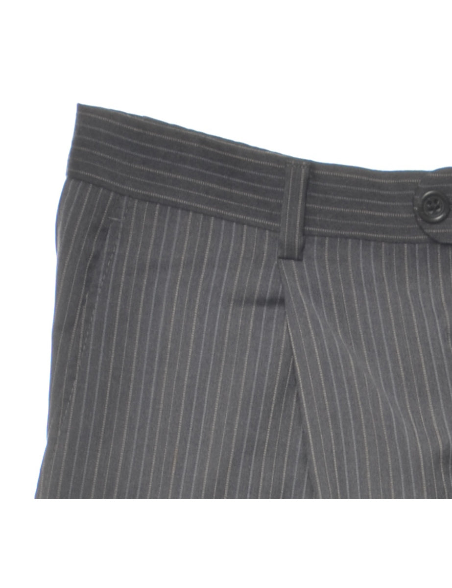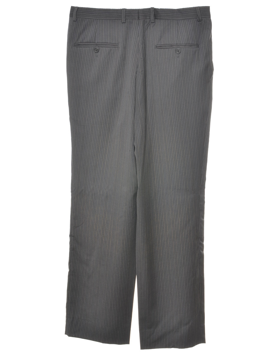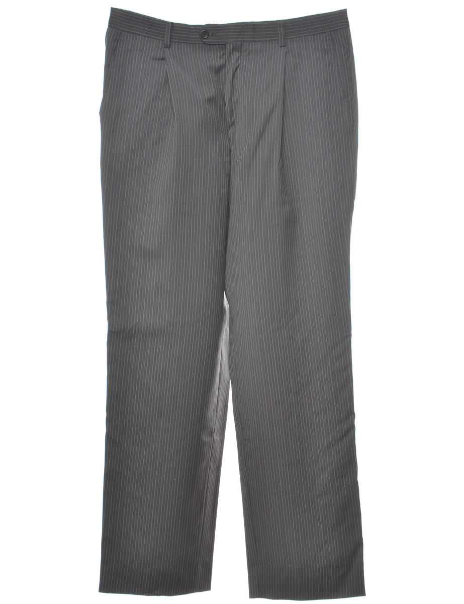 Trousers with pinstripes. Comes in black with belt loops and single pleat.