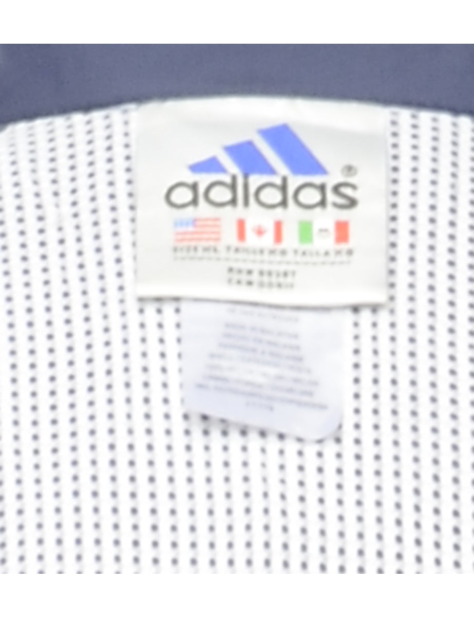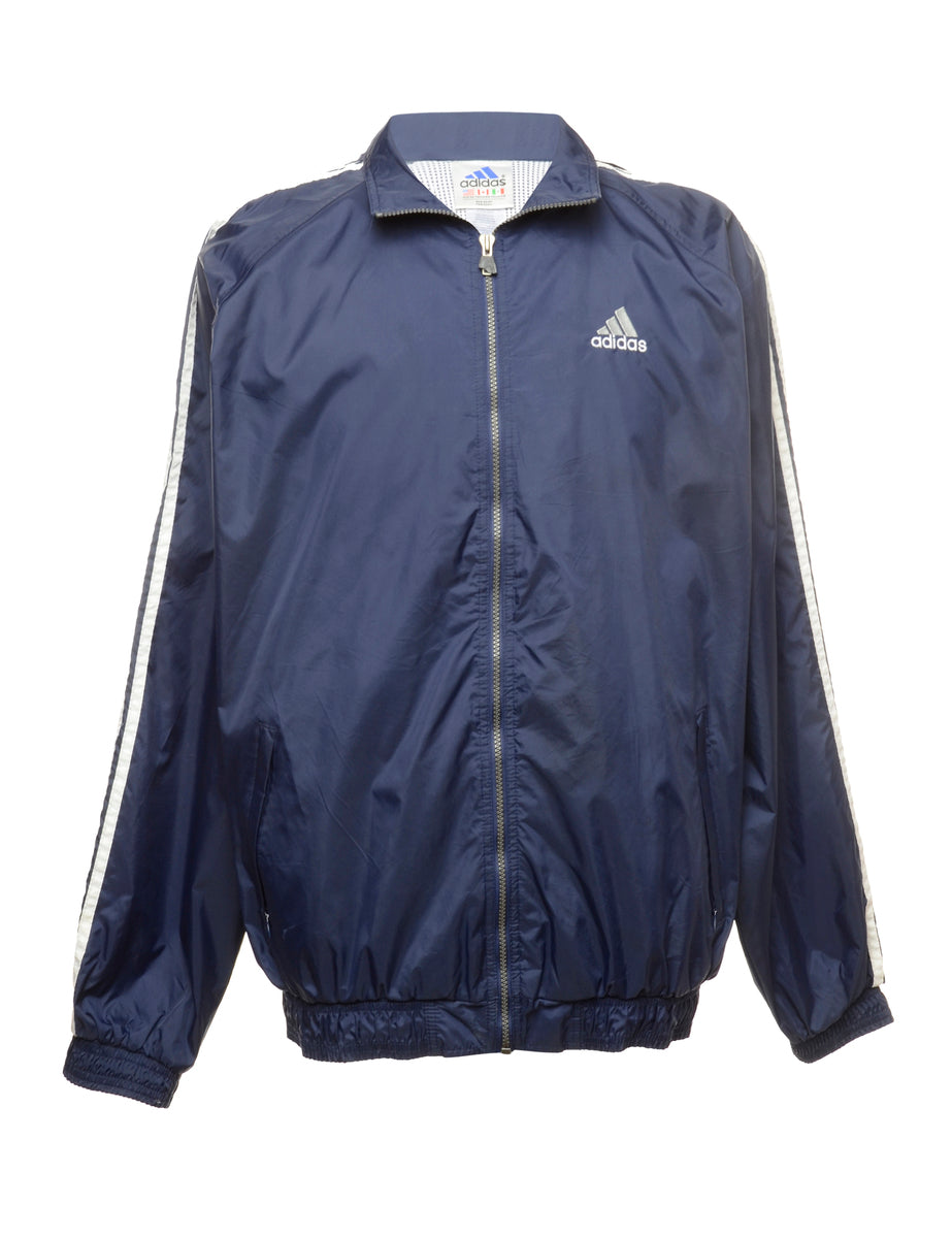 Zip front nylon jacket in navy with pockets and raglan sleeves. From the brand Adidas.