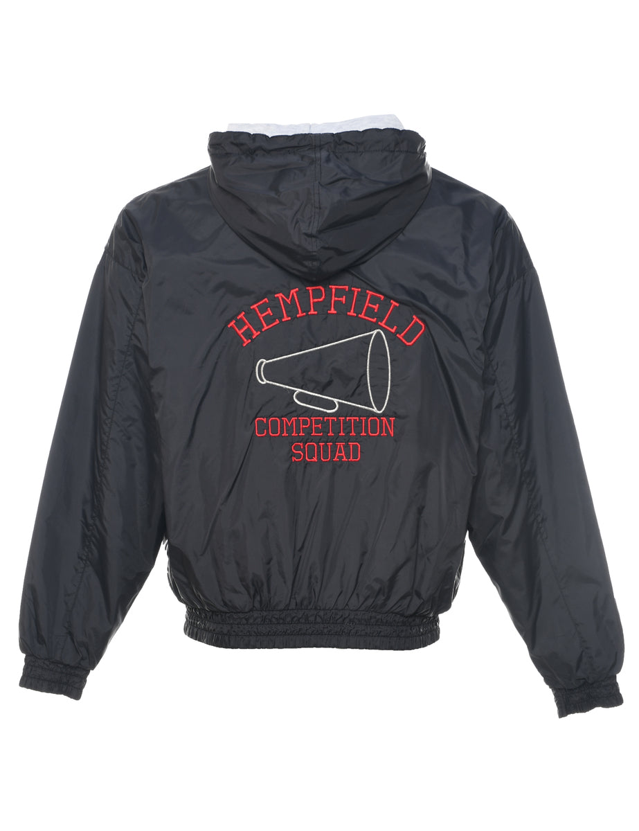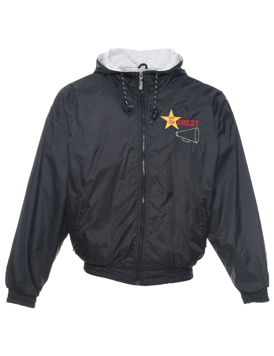 Zip front black ashley nylon jacket with a hood and multiple pockets.