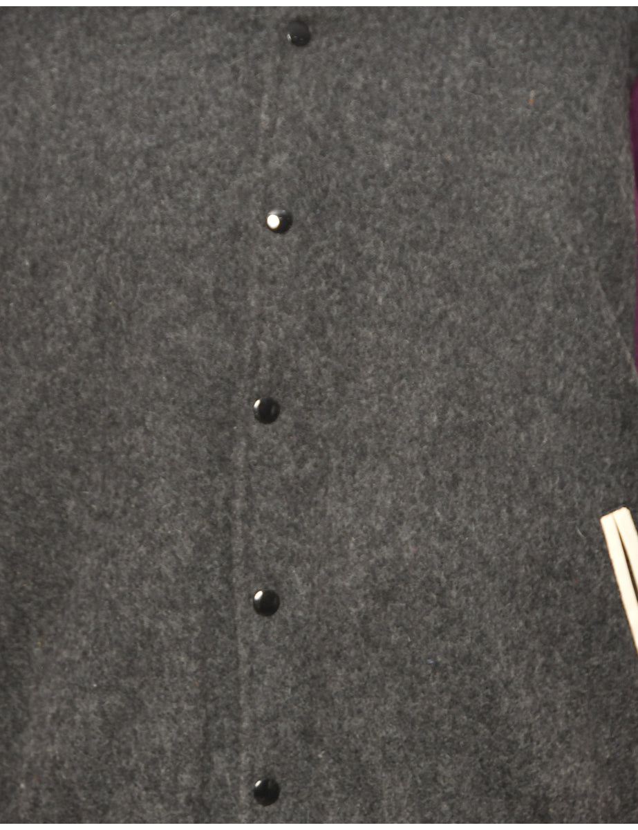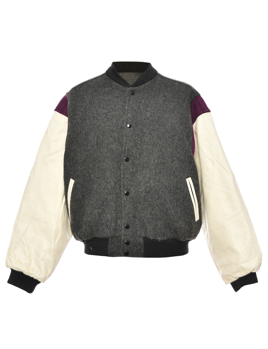 Grey & off-white MCA varsity jacket complete with multiple pockets.
