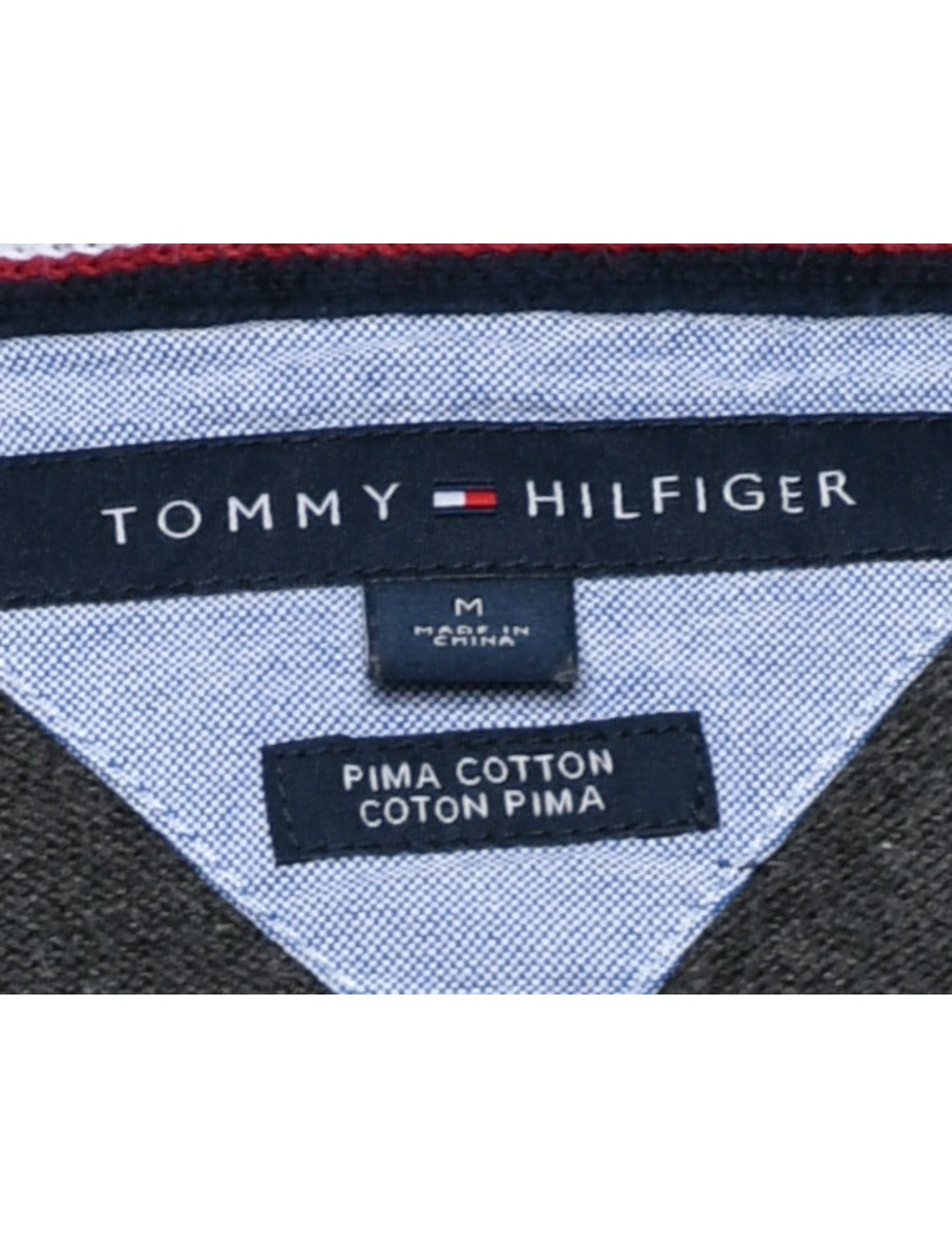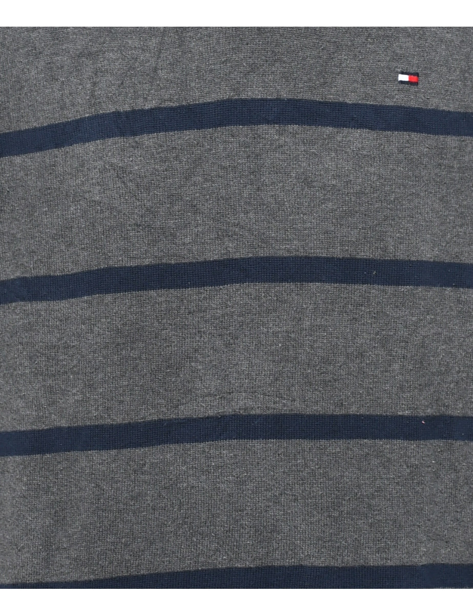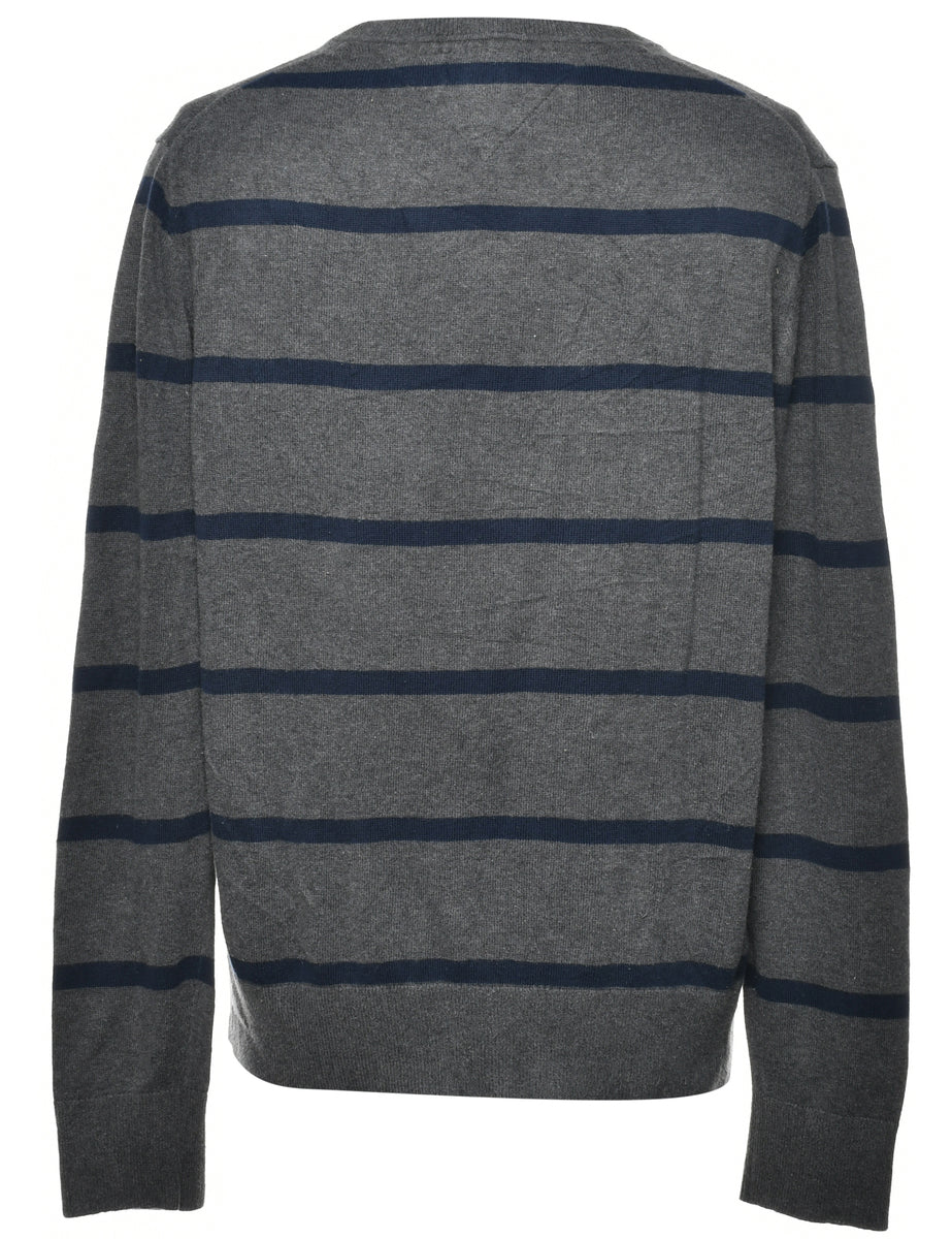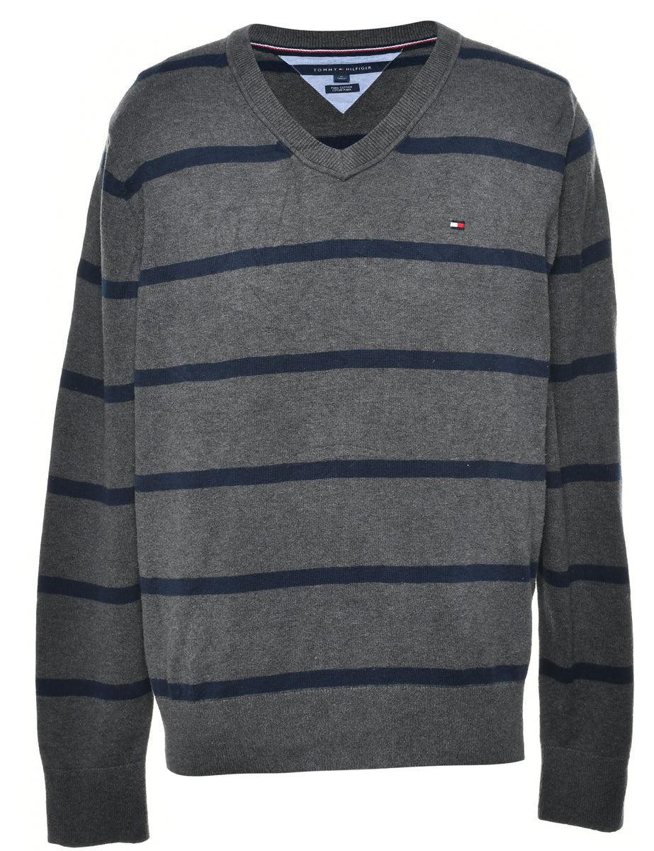 Striped dark grey Tommy Hilfiger jumper with a v-neck.