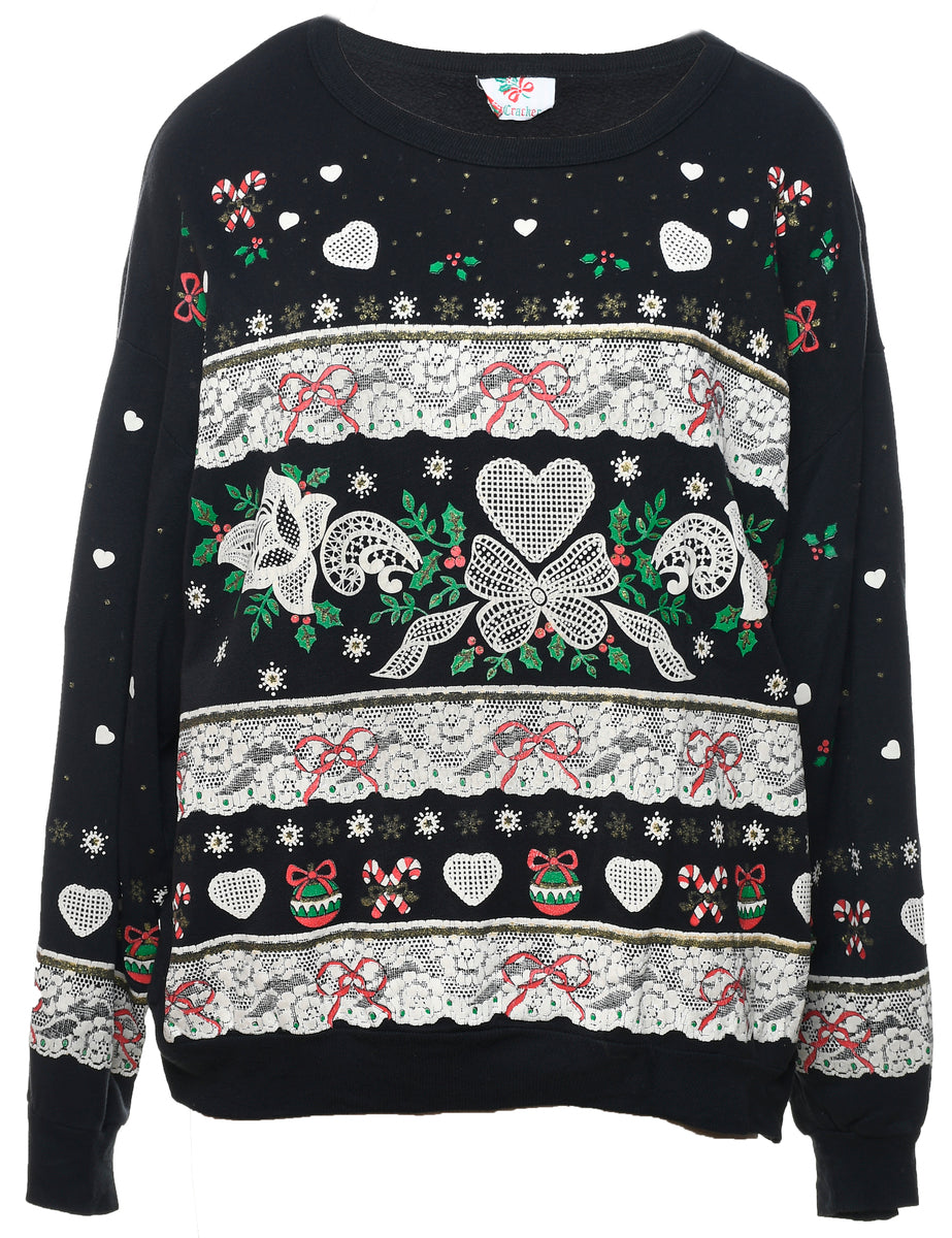 Black patterned Christmas sweatshirt complete with a ribbed neck and cuffs.