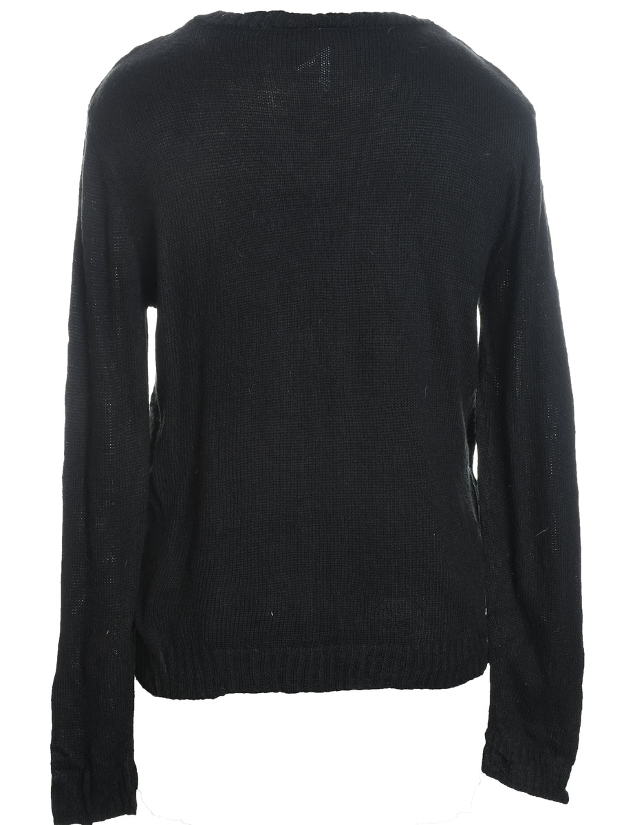 Festive season jumper in black with christmas tree design, a drop shoulder.