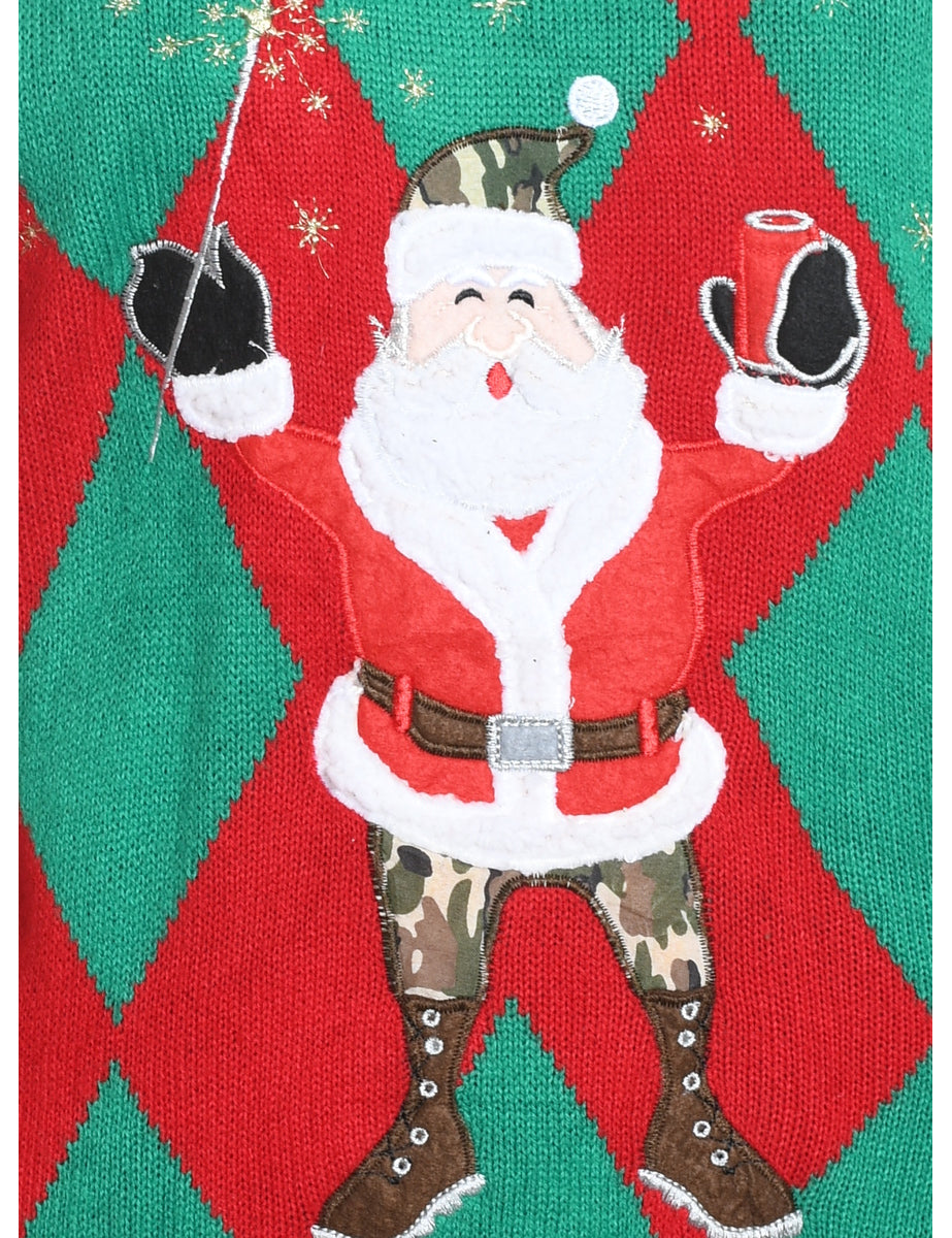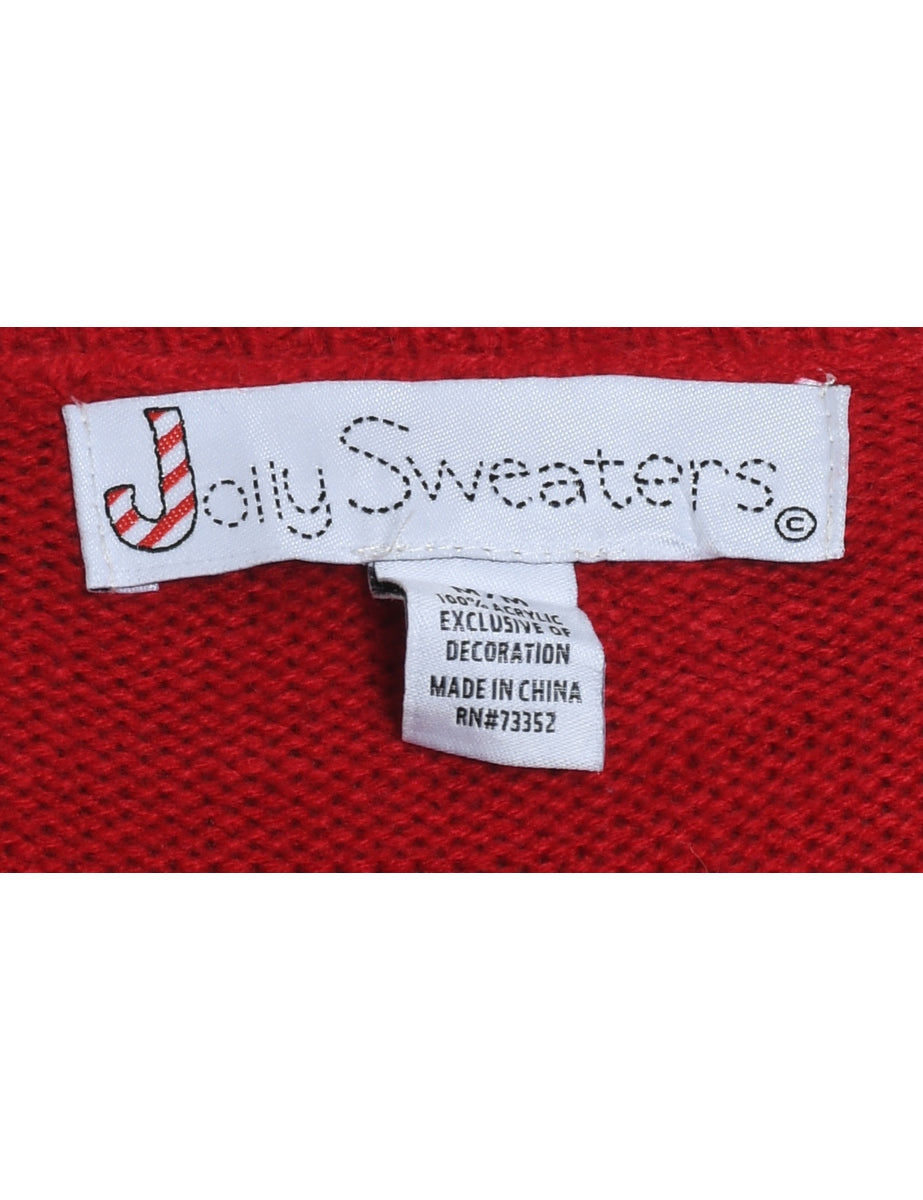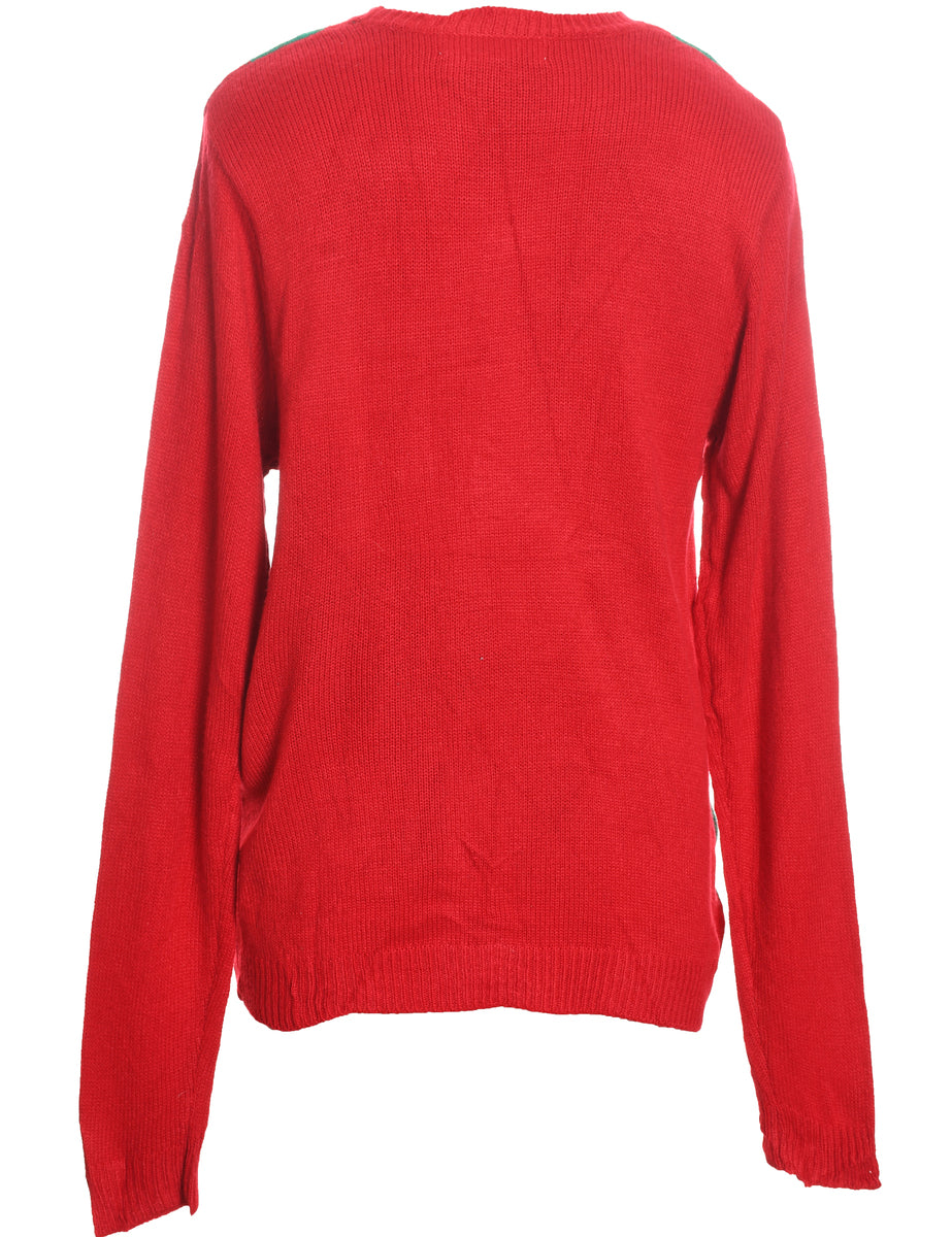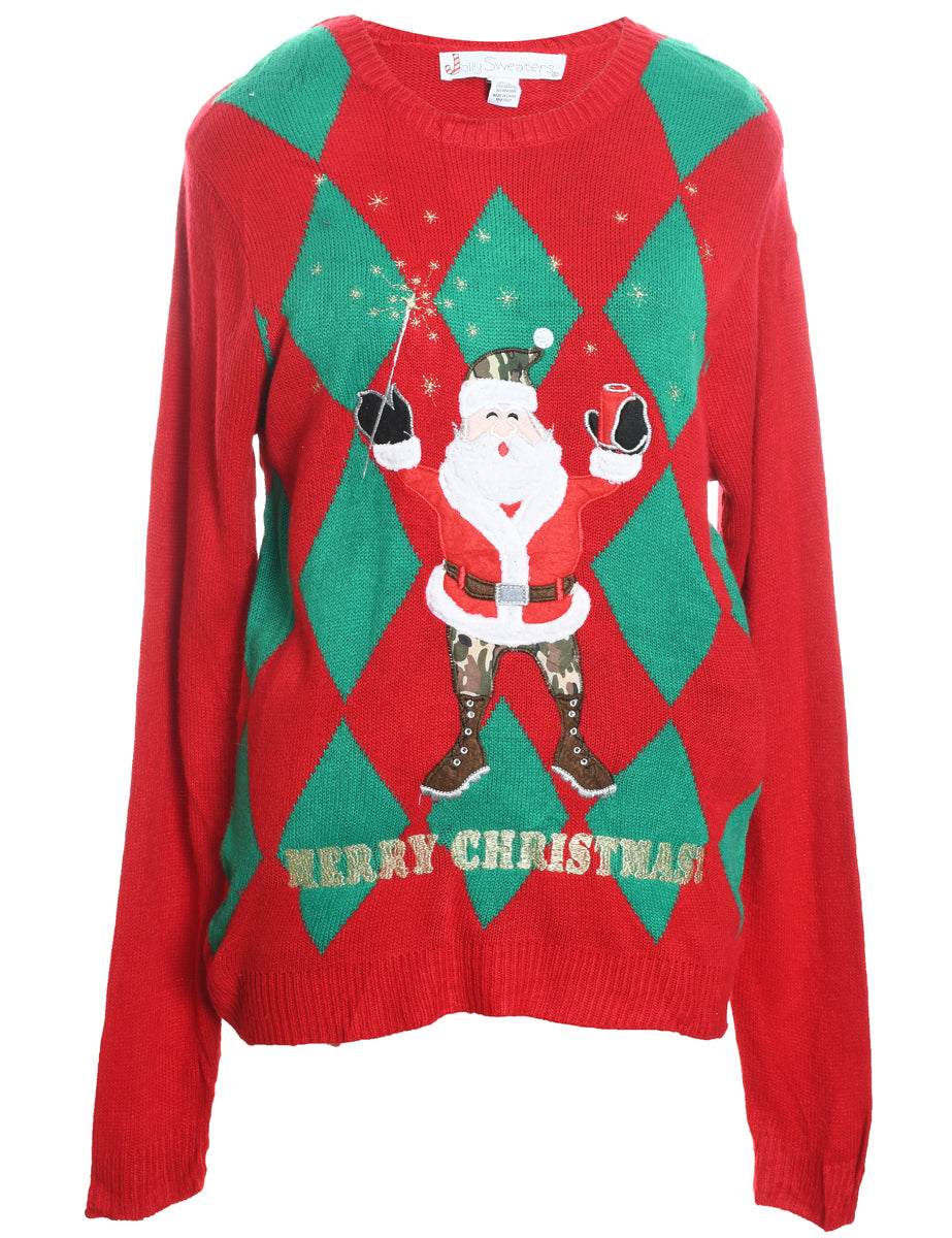 Santa claus christmas jumper comes in red with an applique design and a drop shoulder.