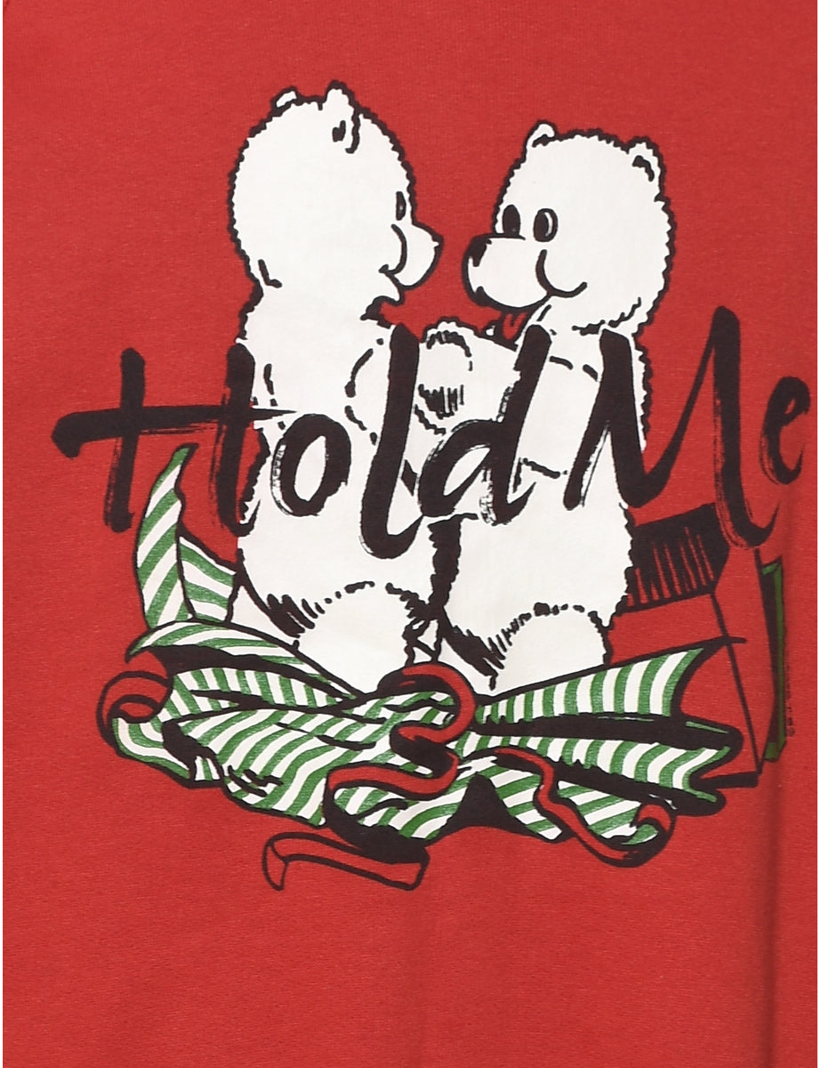 Teddy bear print Christmas jumper comes in red with raglan sleeves.