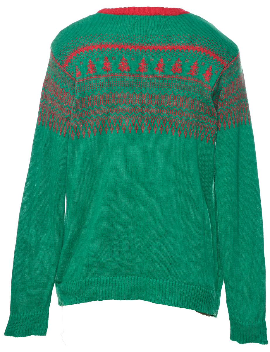 Festive season green christmas jumper with an applique design and a drop shoulder.