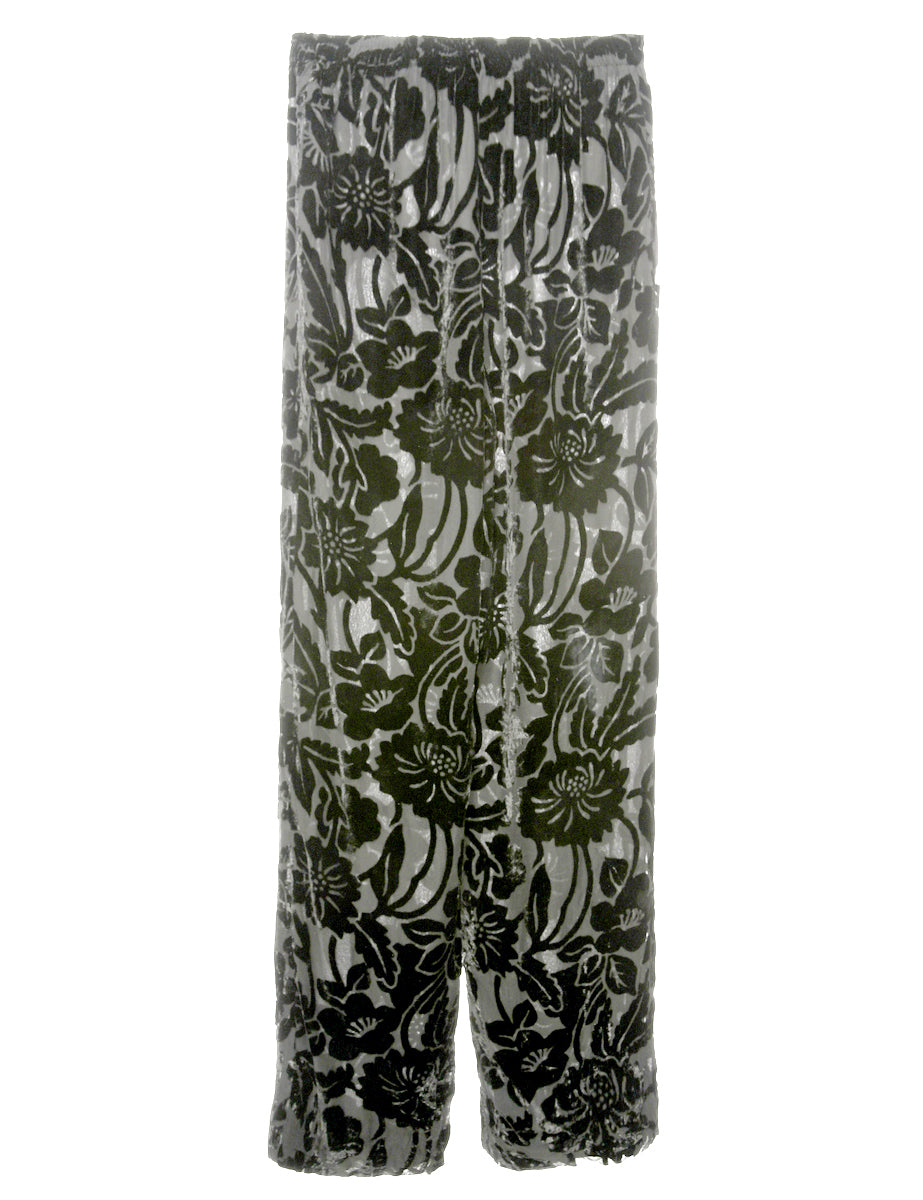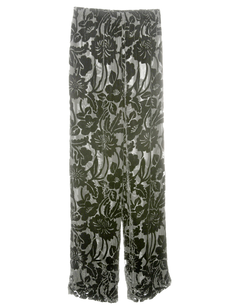 Floral black & grey velvet trousers complete with an elasticized waist.