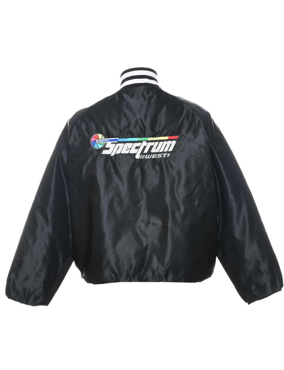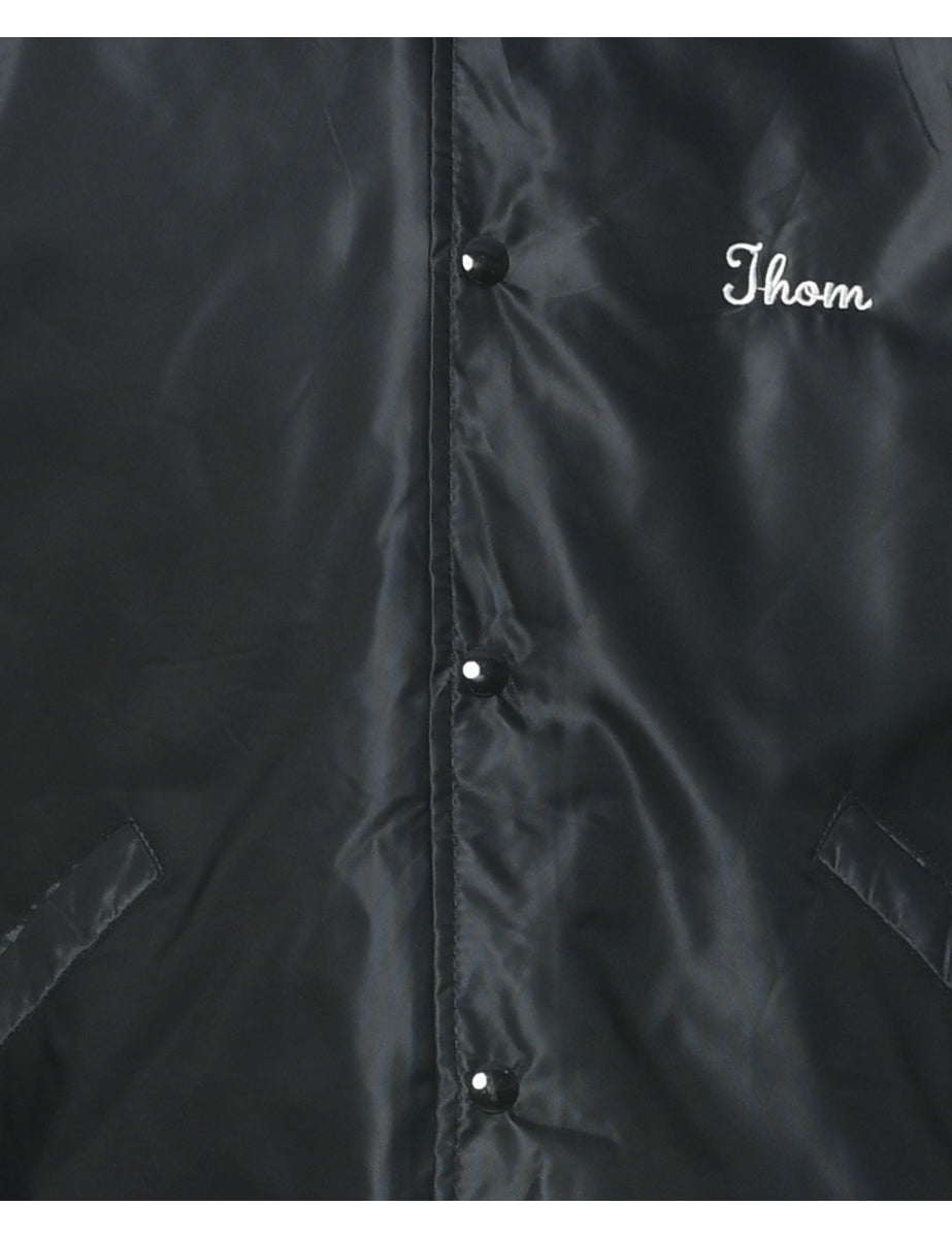 Nylon jacket comes in black with multiple pockets and raglan sleeves.