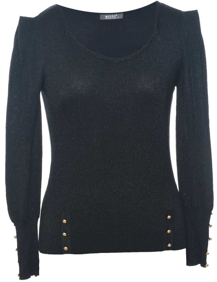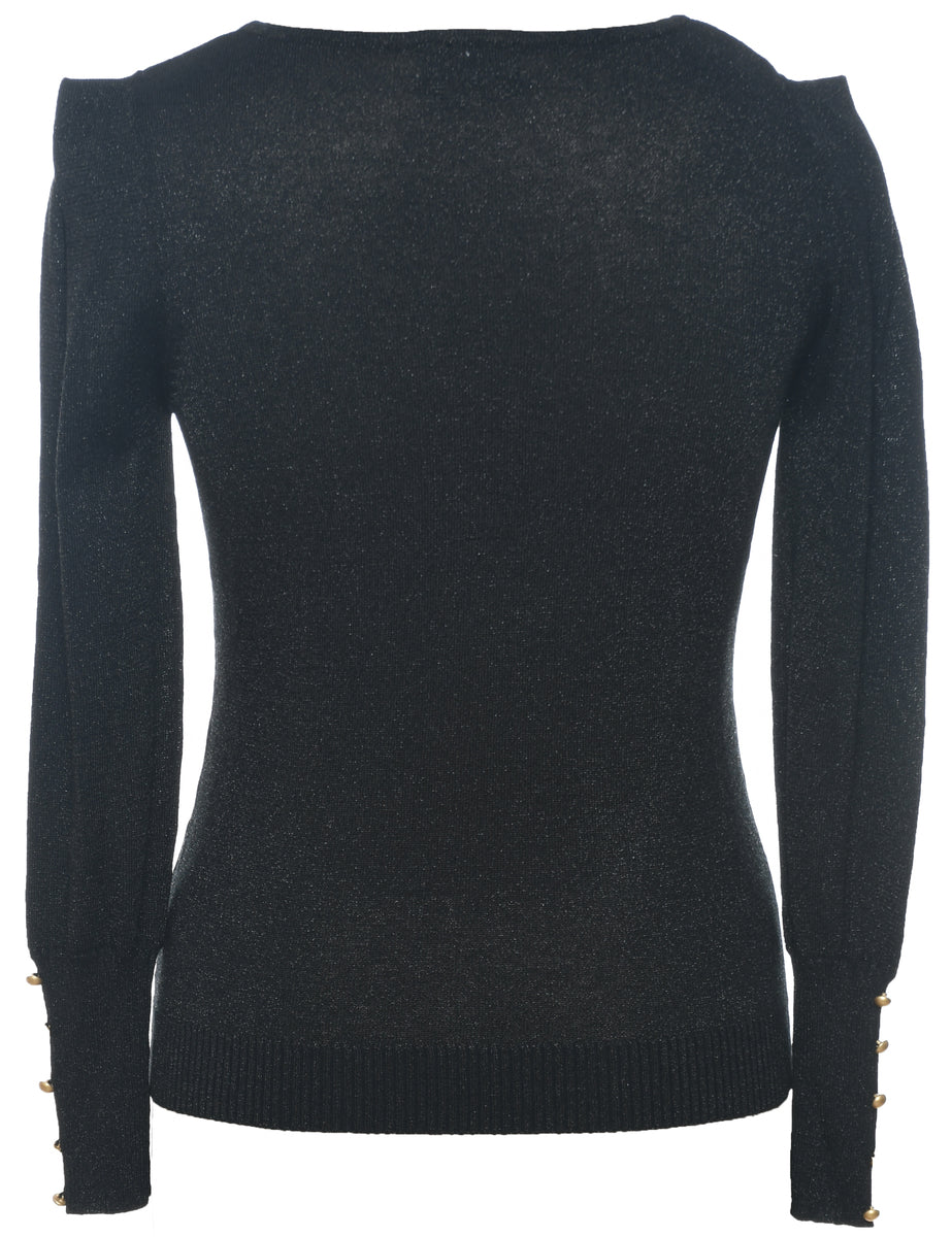 Lurex thread pattern jumper comes in black with puff sleeves.