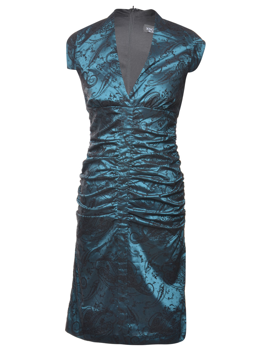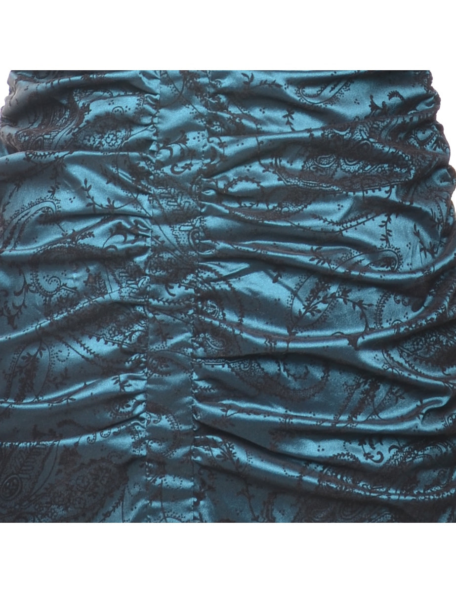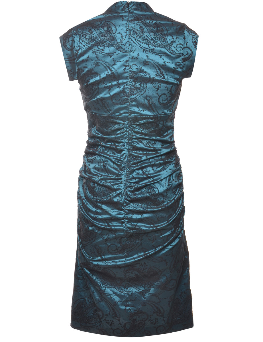 Paisley print evening dress comes in dark green with a cross-over front and full lining.