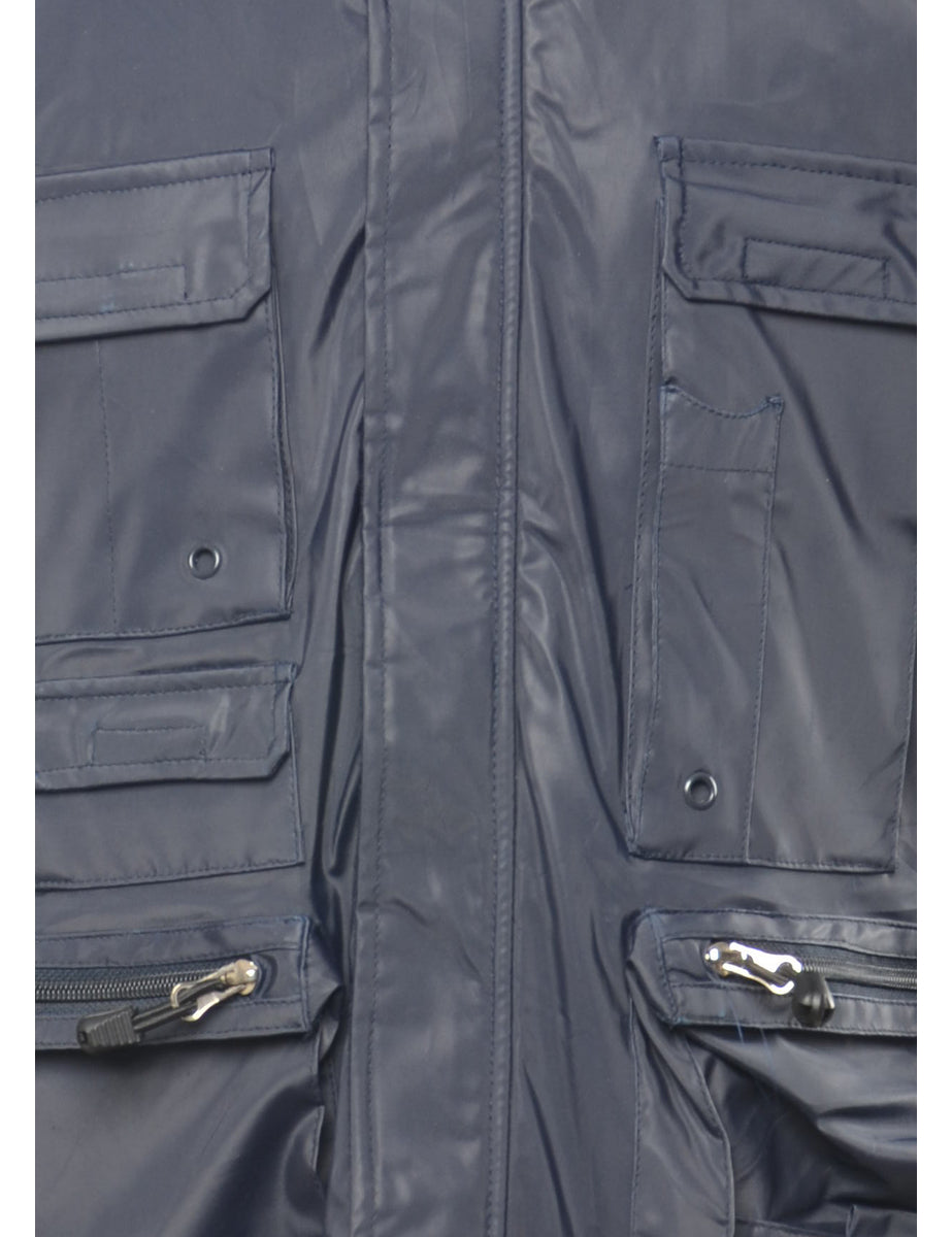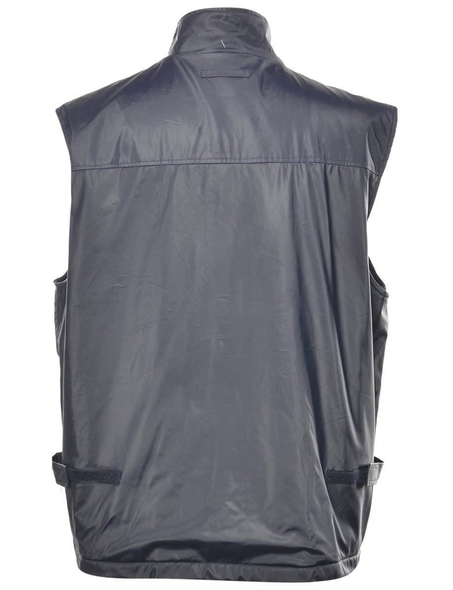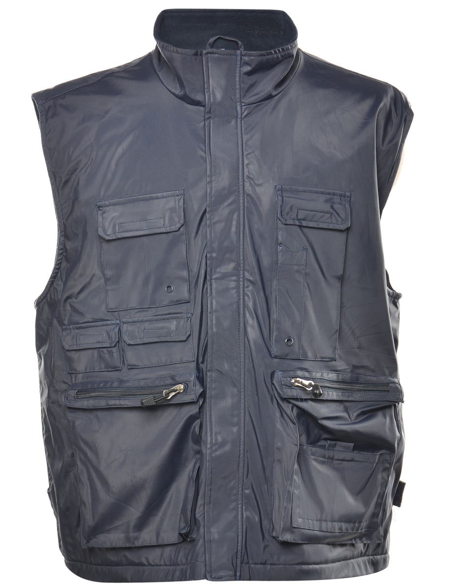 Zip-front navy gilet complete with full lining and multiple pockets.