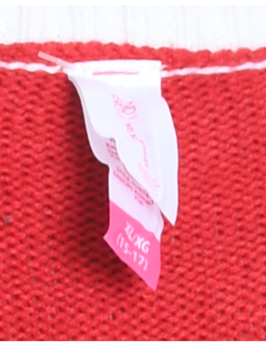 Festive print christmas jumper in red with a round neck and pom poms.