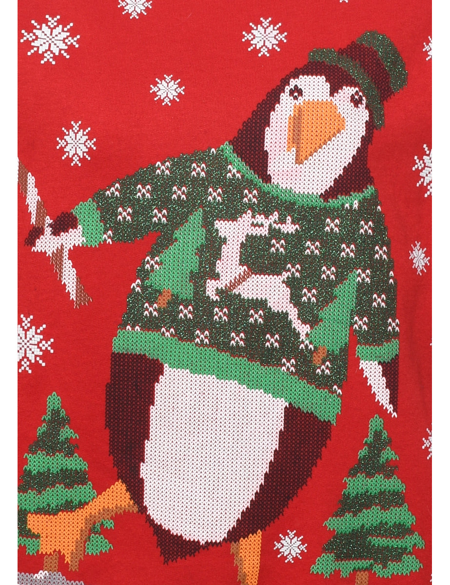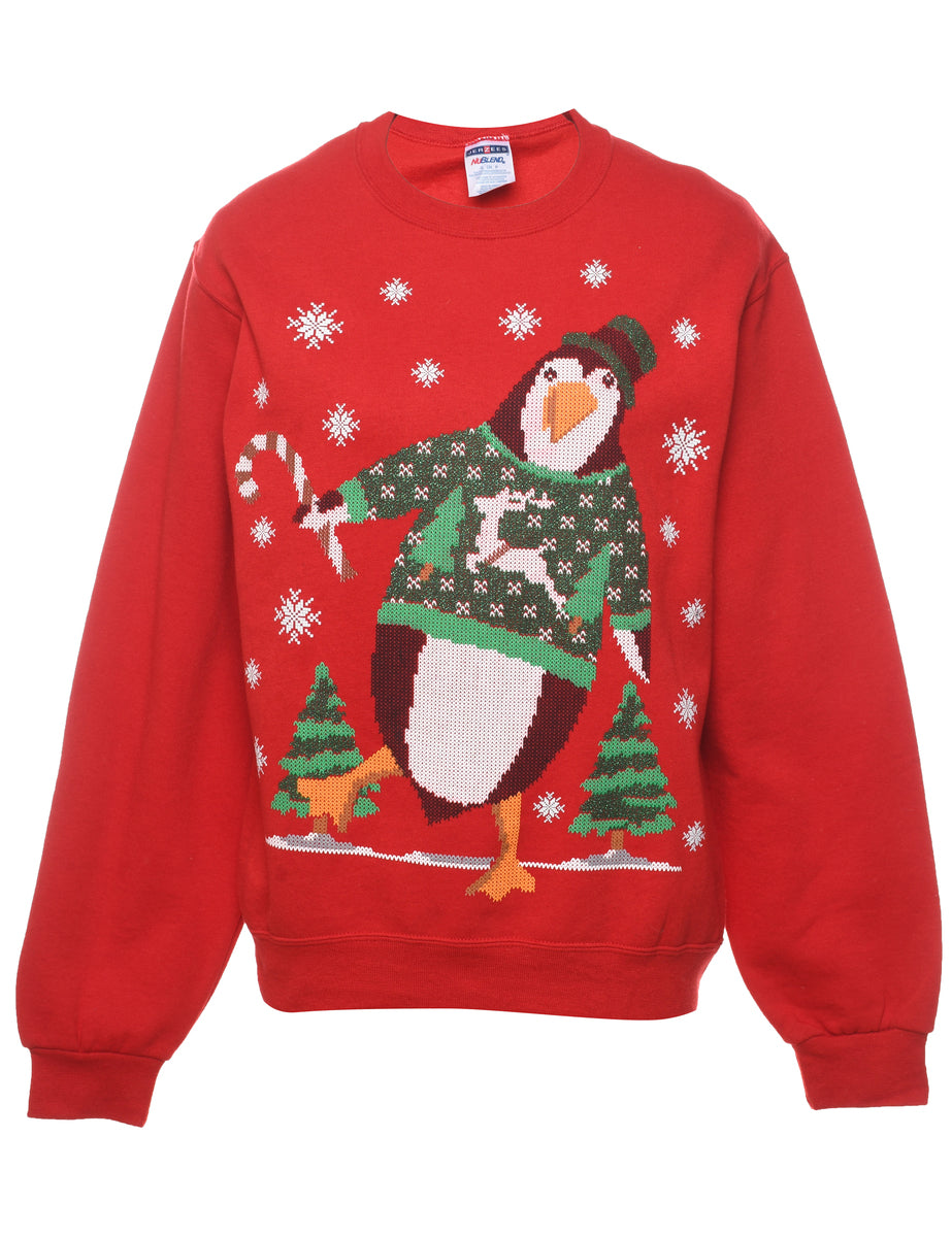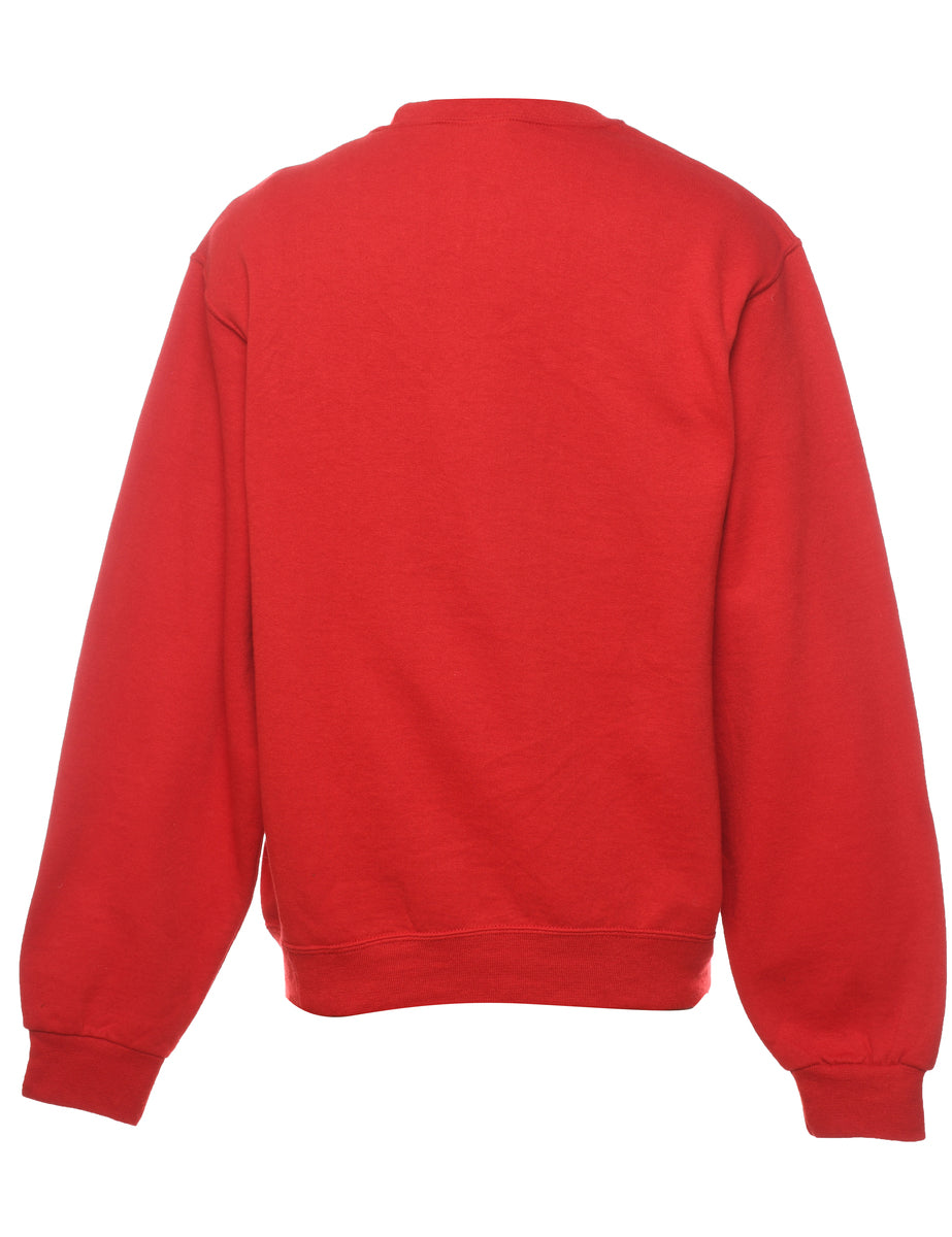 Festive print christmas sweatshirt comes in red with a round neck.