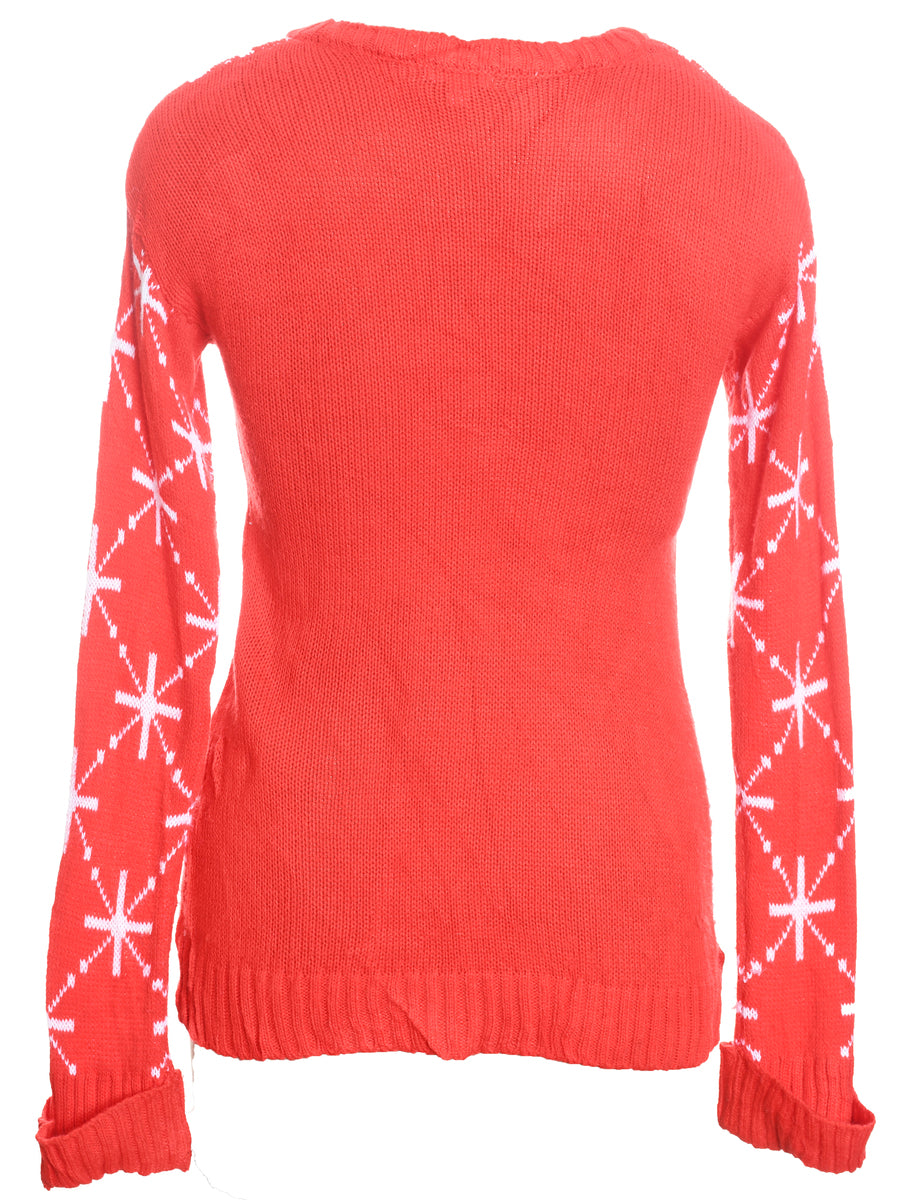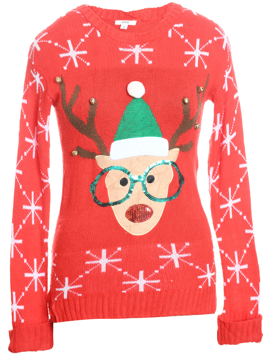 Reindeer christmas jumper comes in red with a drop shoulder and small bells attached.
