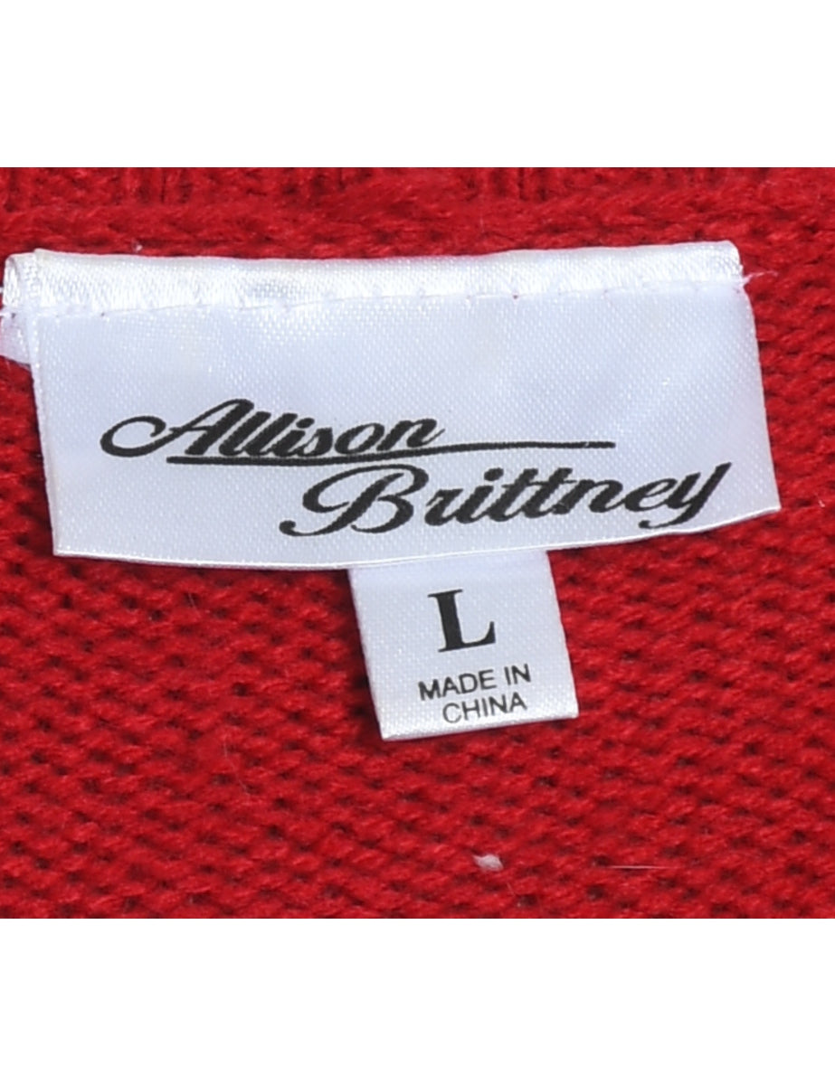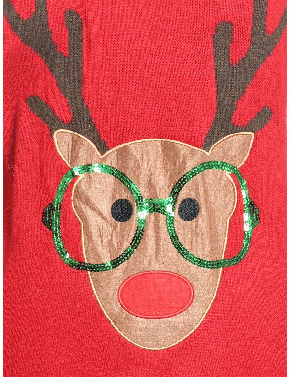 Reindeer christmas jumper in red with an applique design and sequins.